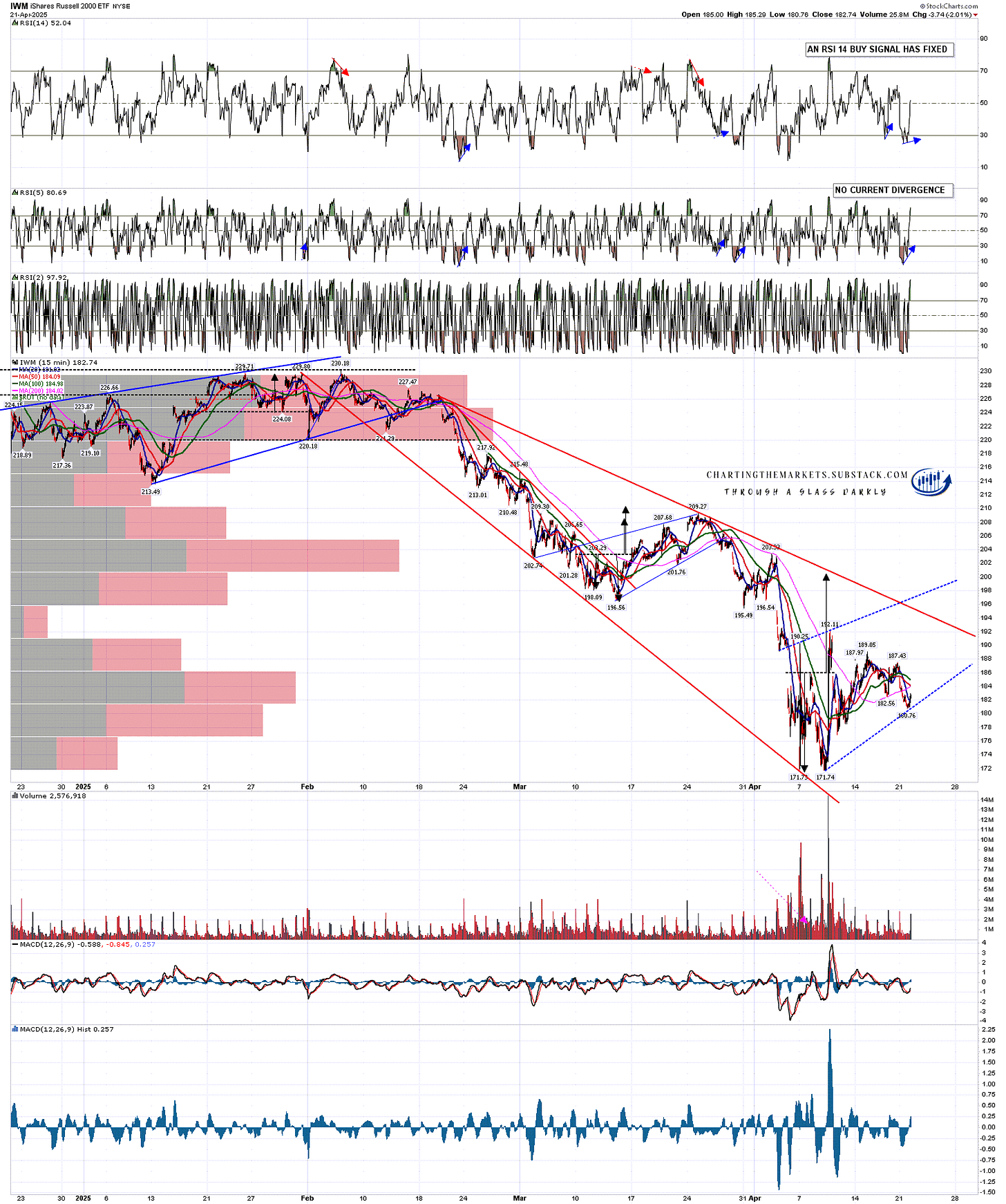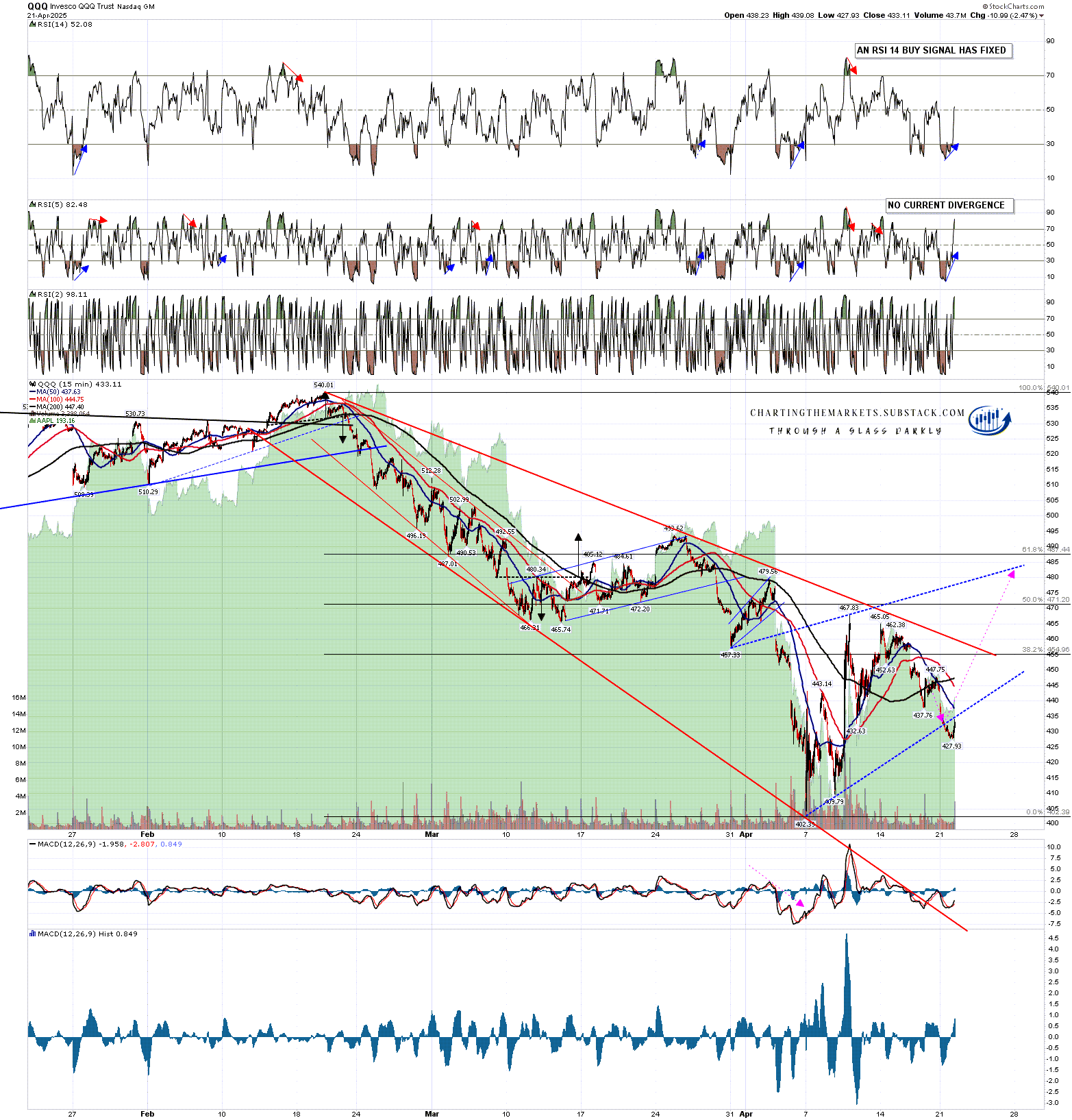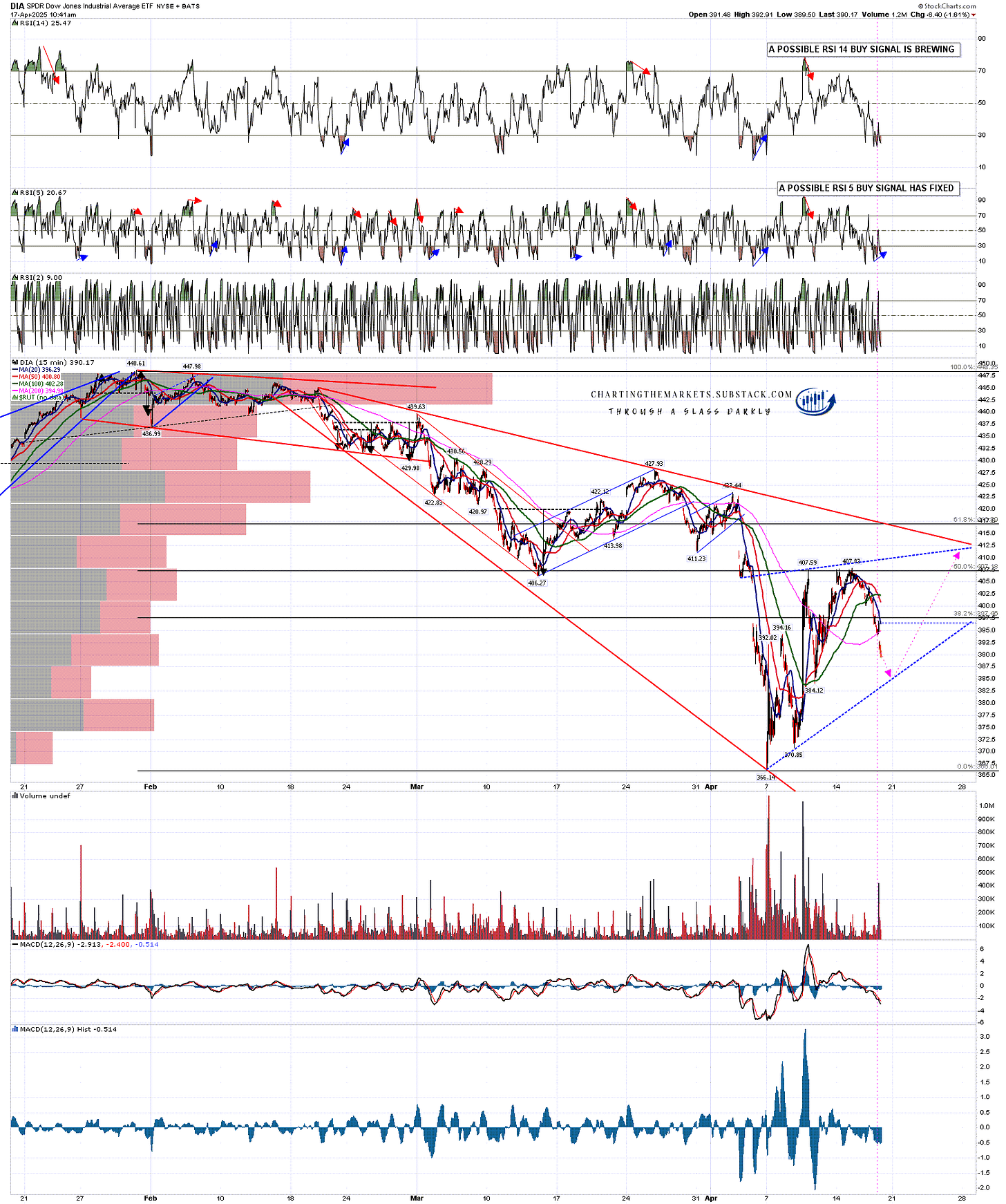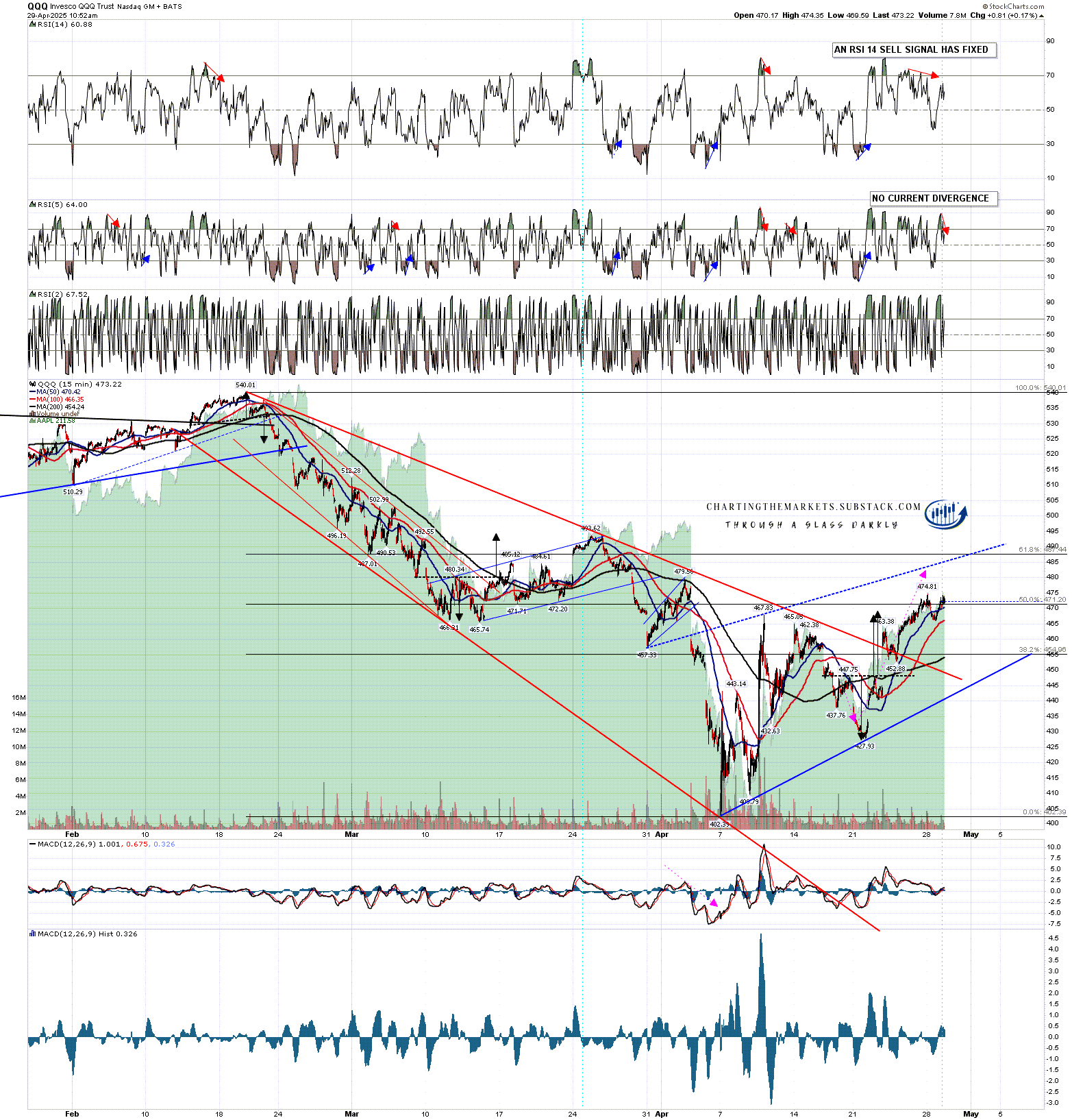 In terms of the ideal bear flag resistance trendline I drew on QQQ on 17th April, that’s still looking good and the current rally high is about ten handles below that (rising) trendline. On the 15min chart an both RSI 14 and RSI 5 sell signals have fixed and there is also a fixed hourly sell signal on NQ.