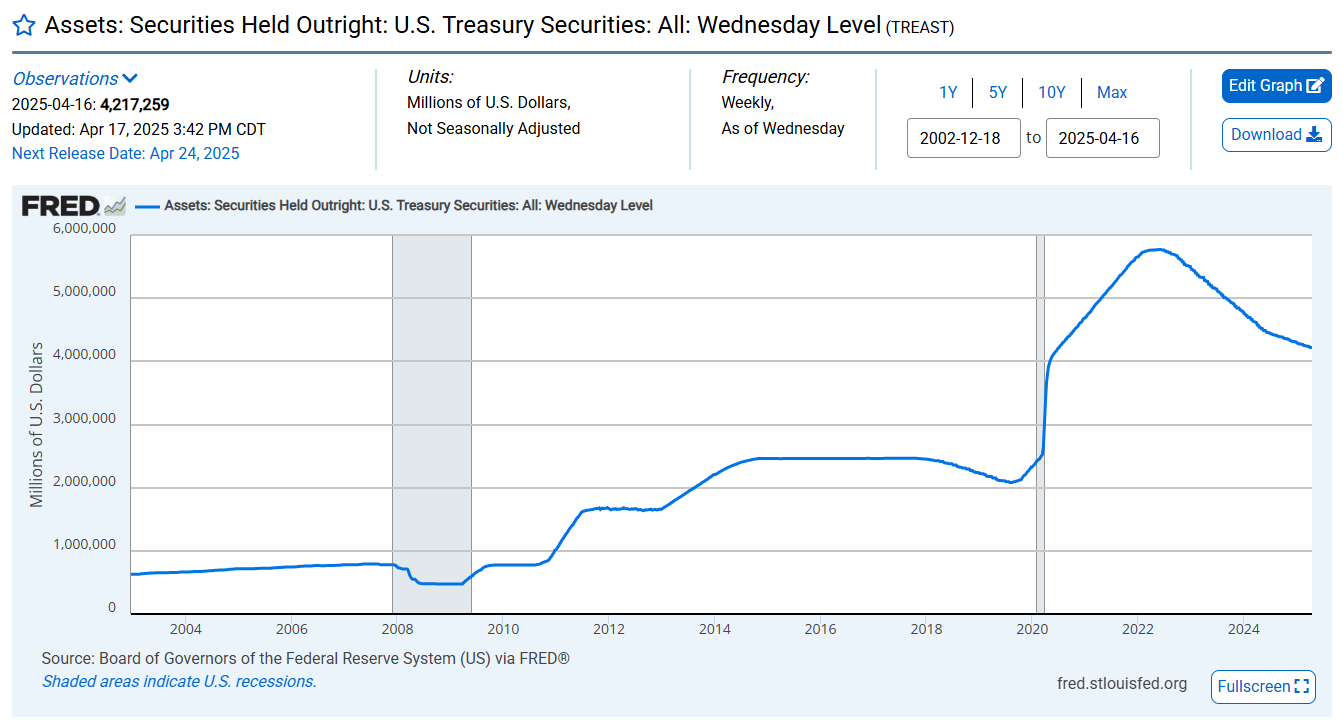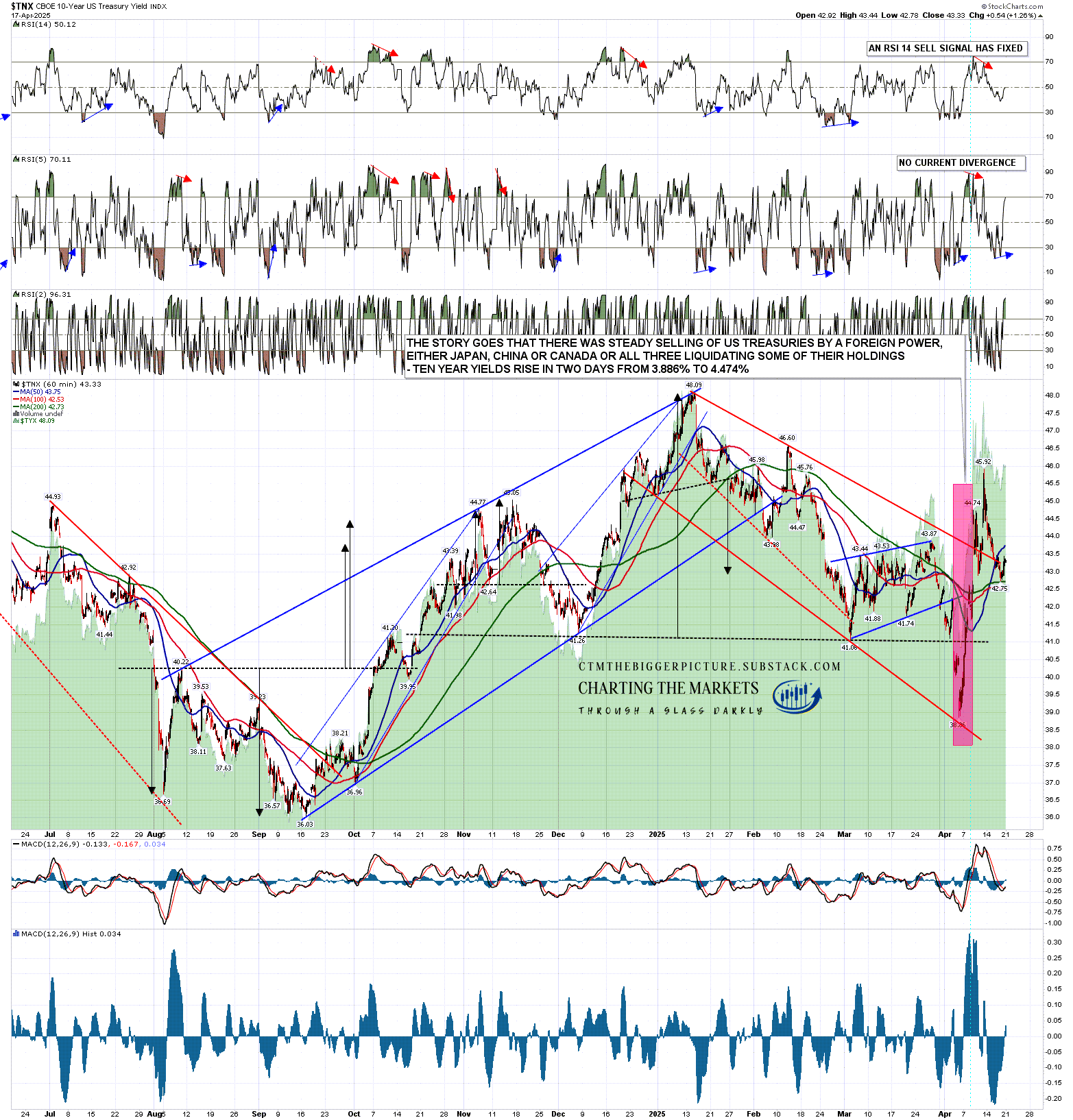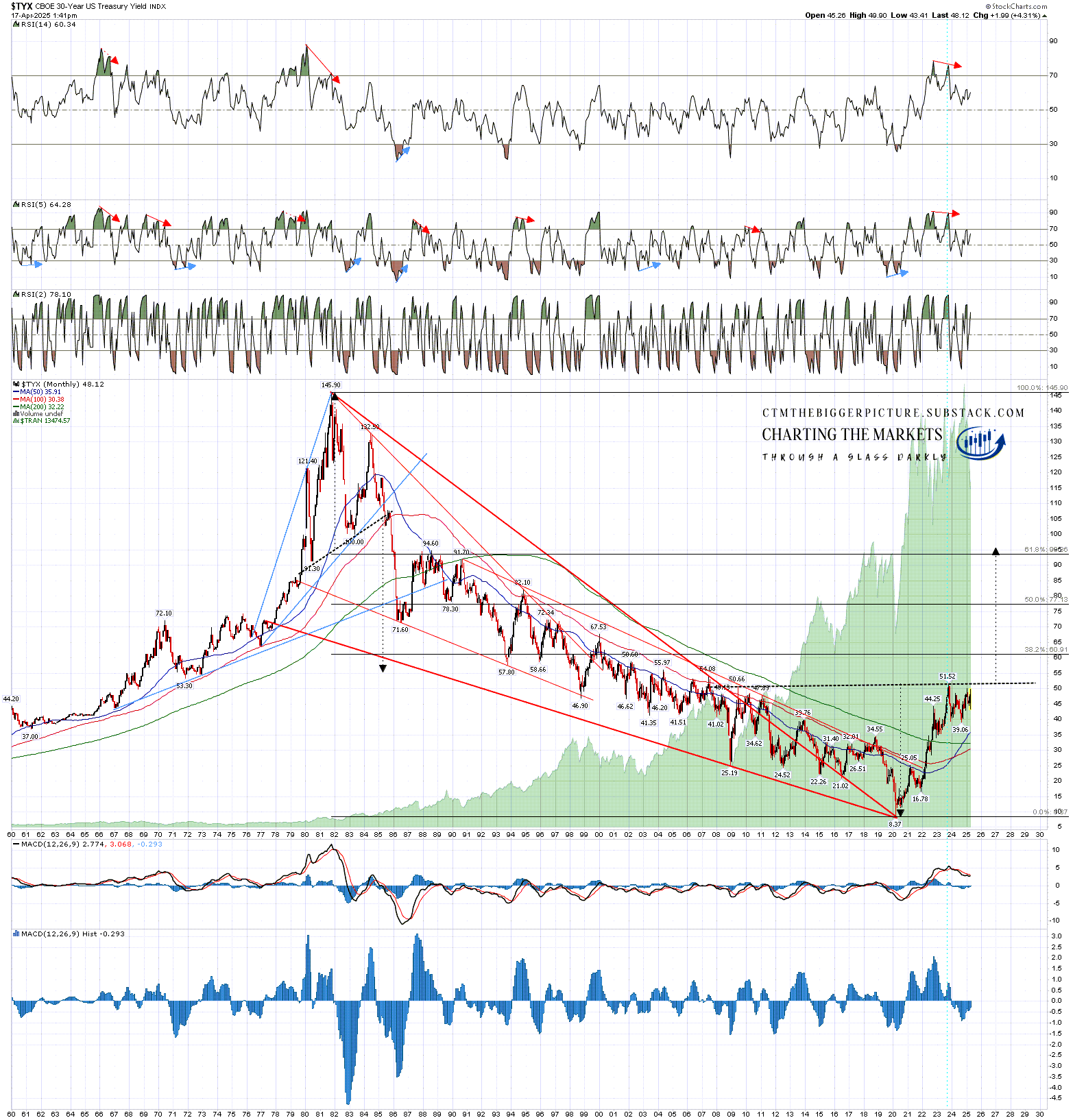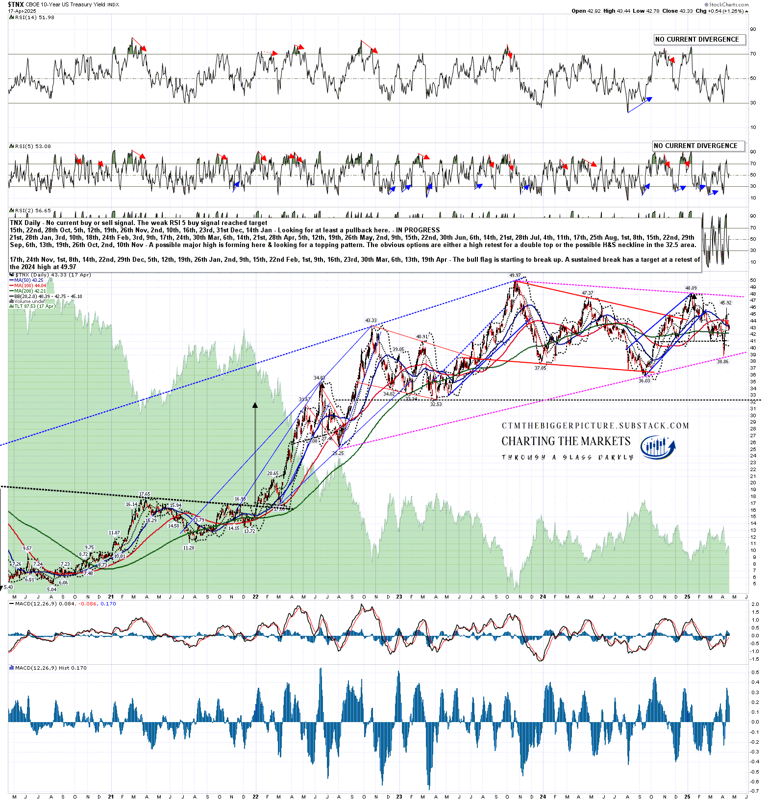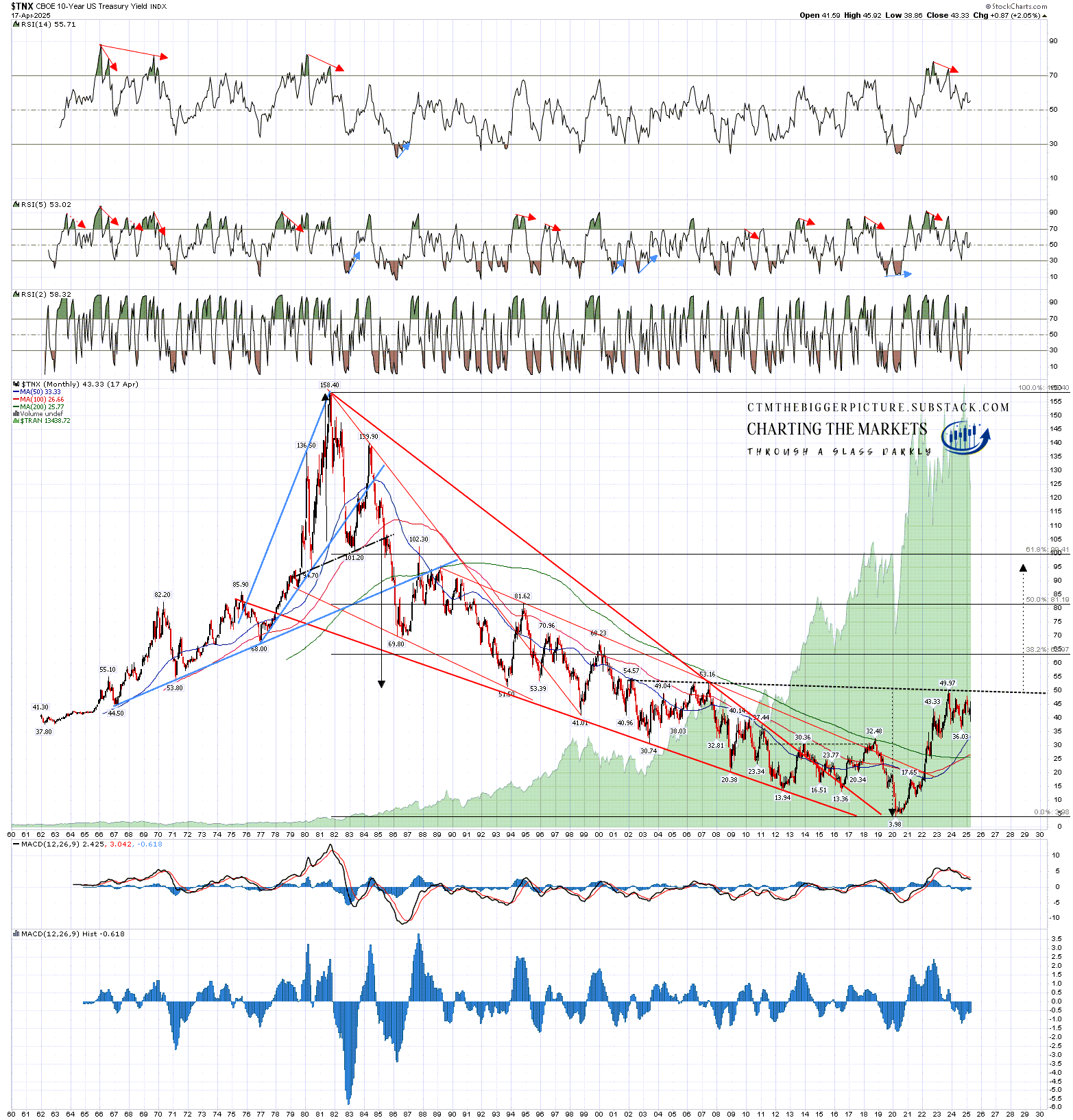 I’m doing a series of (currently four) posts at the moment on my The Bigger Picture substack on the US Dollar, US Treasuries, and the reasons to be very concerned about the possible further sharp declines on both that may be coming this year. The first of these posts is looking at the potentially bearish setup on the US Dollar, the second is looking at the potentially very bearish setup on US Treasuries, the third is looking at the reasons that we may see a bond market crisis this year, and will be published this week and the fourth will be looking at why the US Dollar may lose its status as the main reserve currency for the world, what that would likely look at and what other currencies and instruments might partly replace it. Everyone trading equities in this wild year should read these.