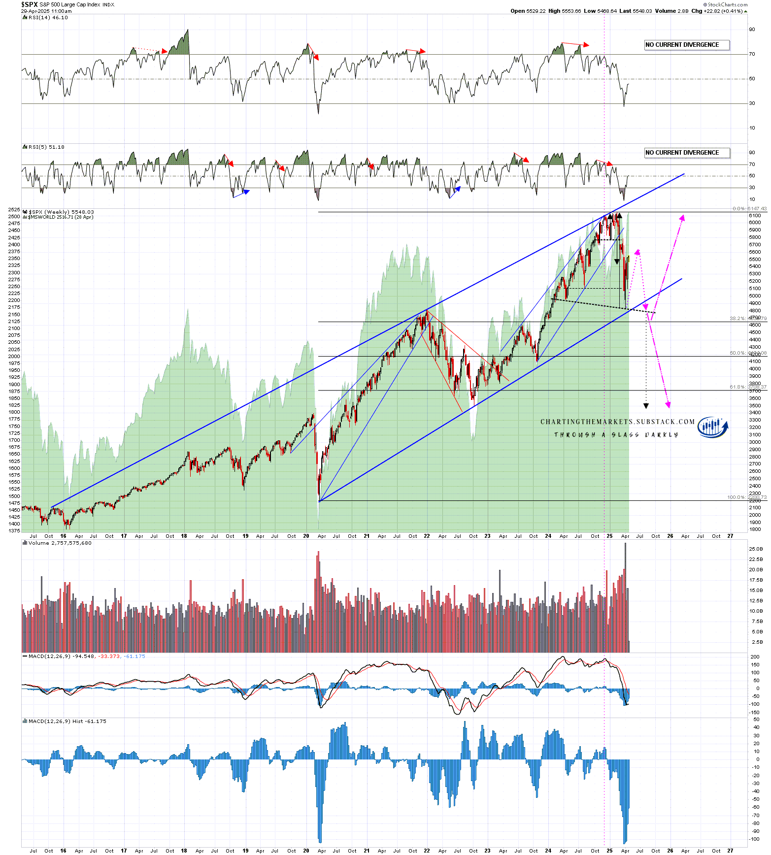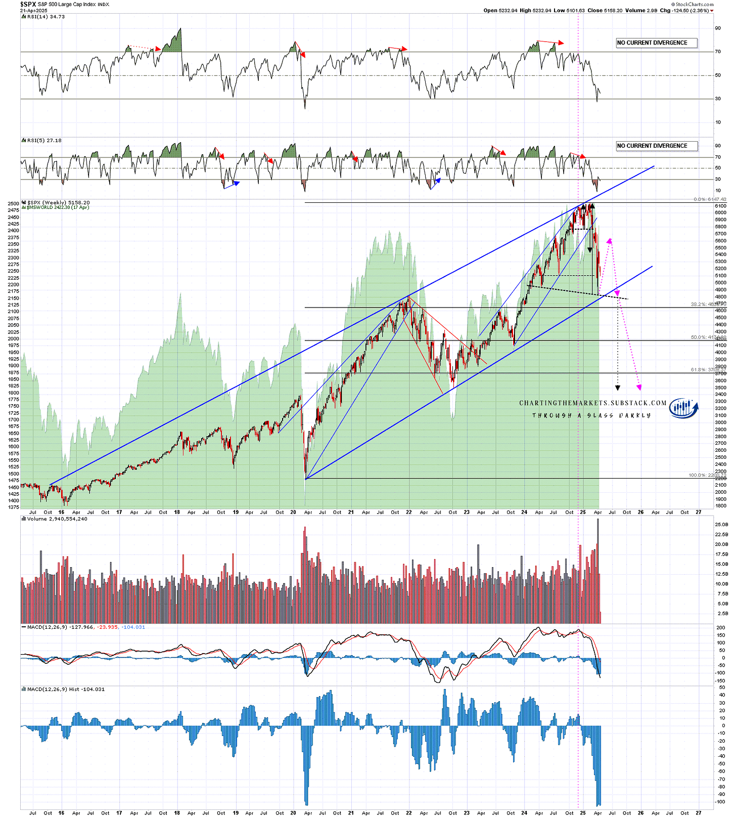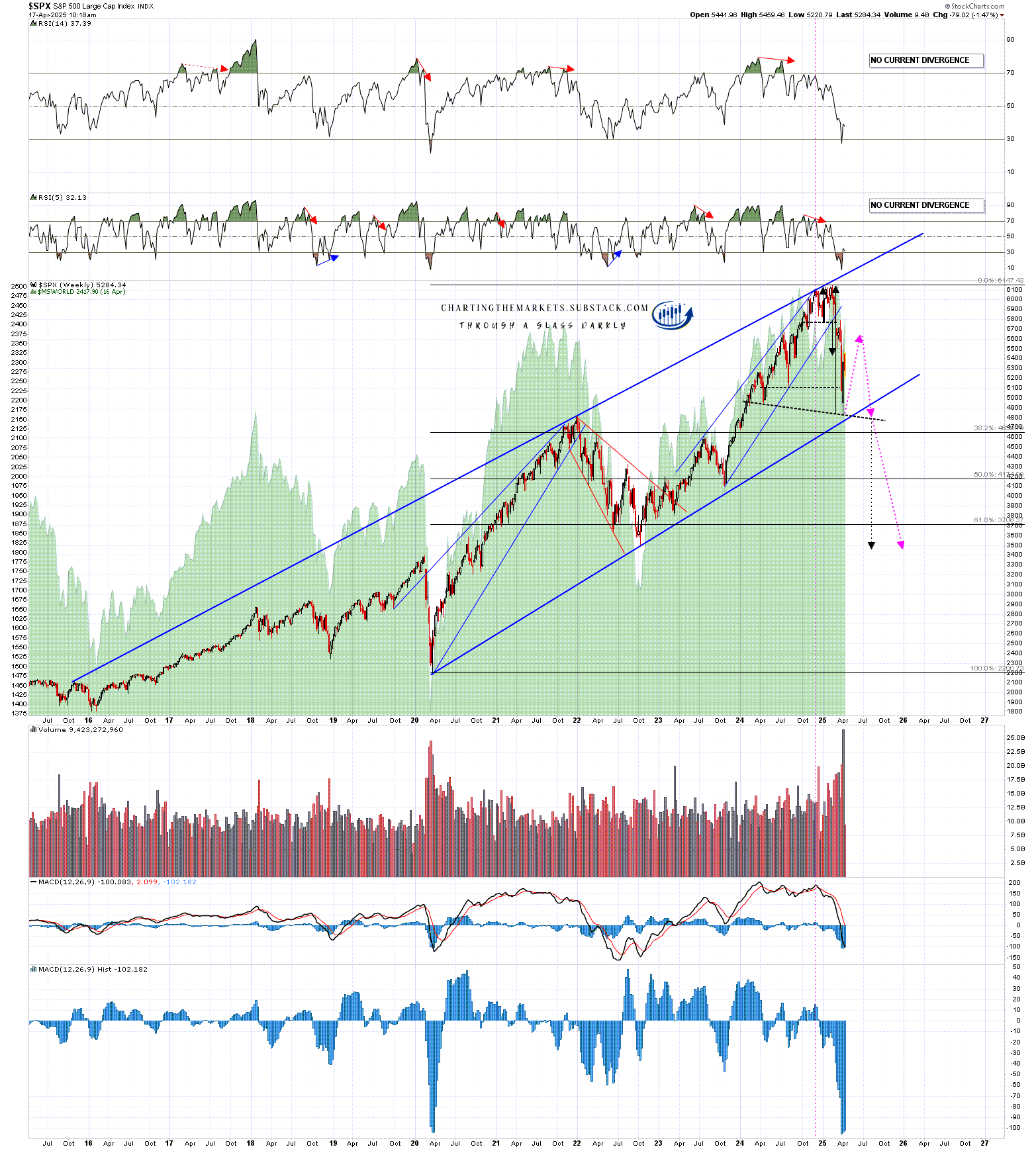 I published a post on Tuesday 1st April on my bigger picture substack arguing that tariffs would likely go ahead, that the odds of seeing a serious bear market this year were now high and that a full market crash this year was now potentially on the cards. IWM was already in technical bear market territory (decline of over 20% from high), SPX and QQQ reached the 20% level late last week and, at the low yesterday, DIA is currently down 18.383% from the high. I then published another post on Tuesday 1st April on my bigger picture substack looking for a downside target on SPX at 5100, and that was reached on Friday 4th April.