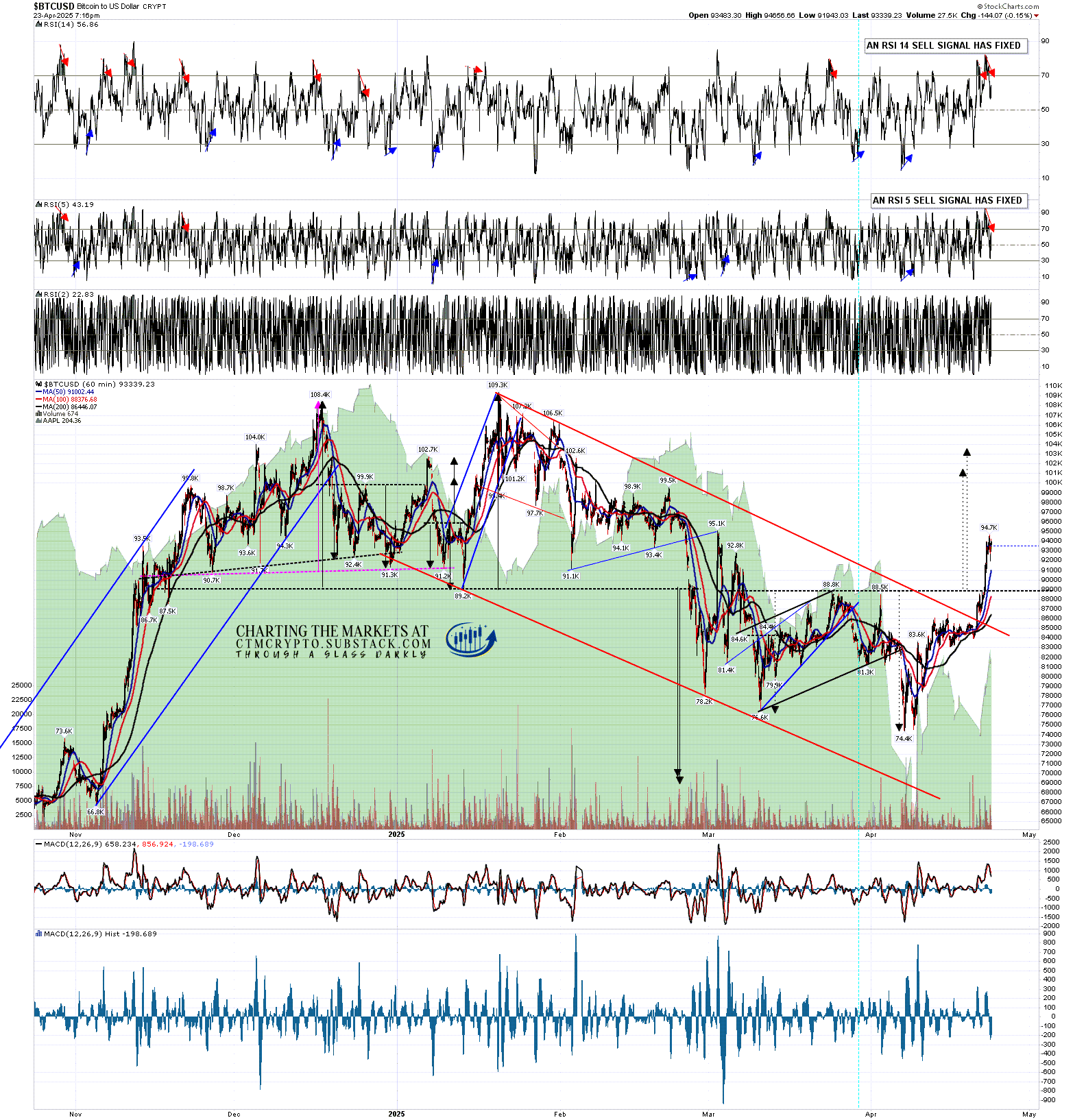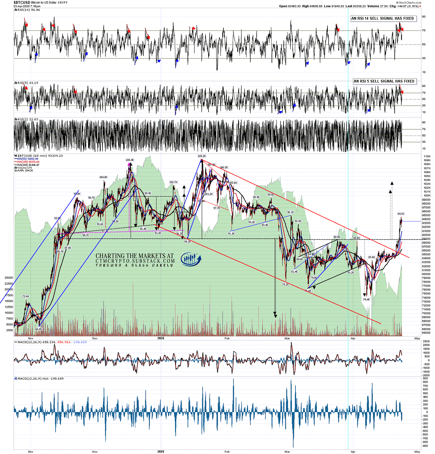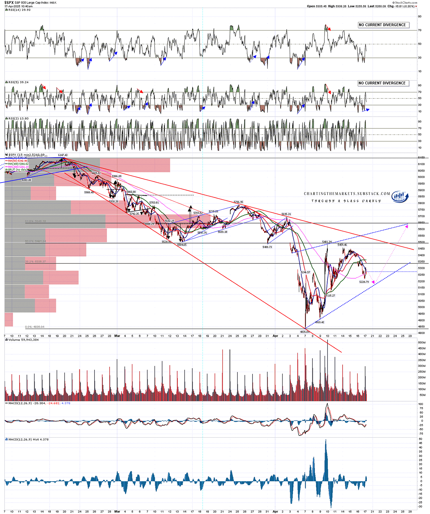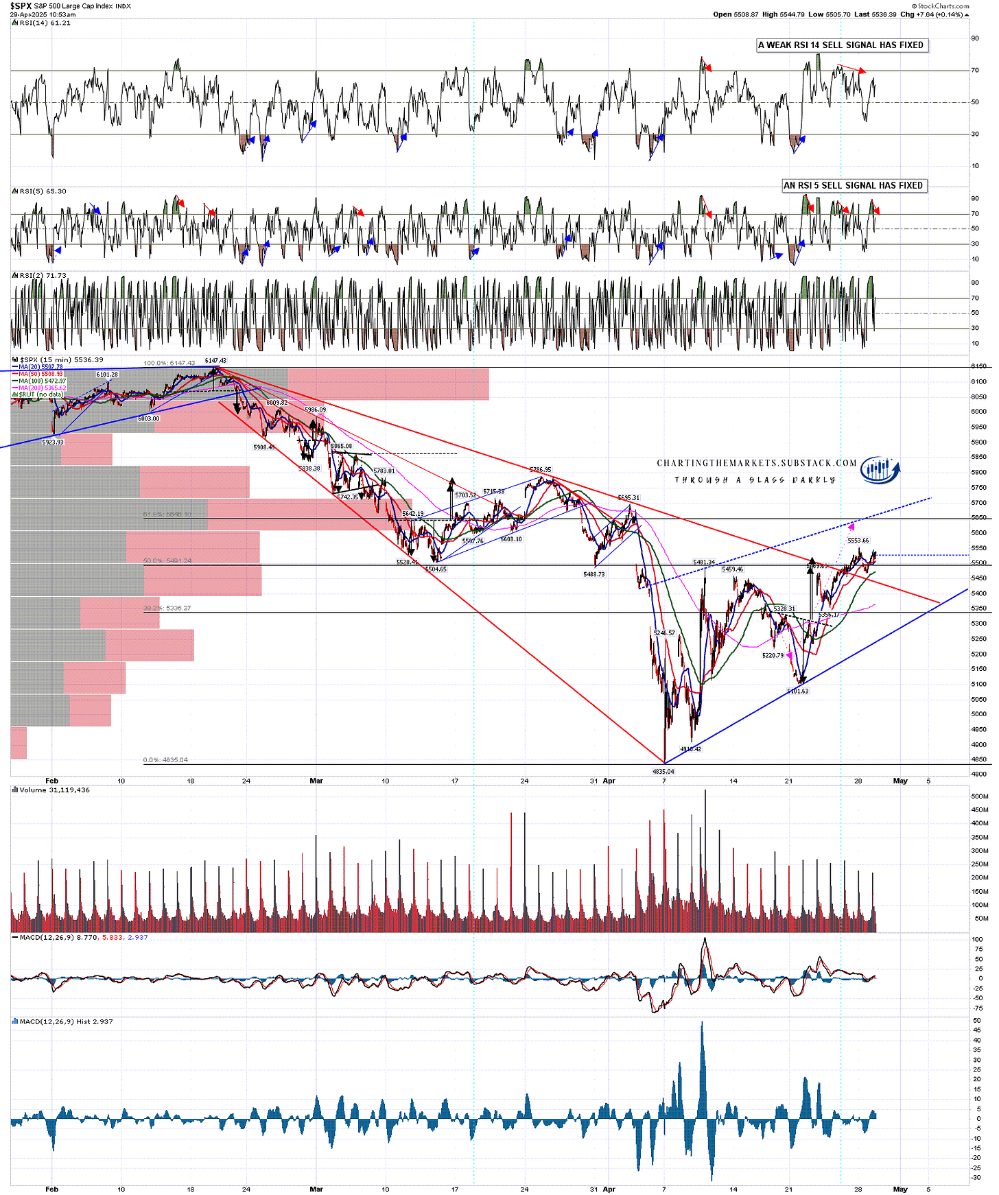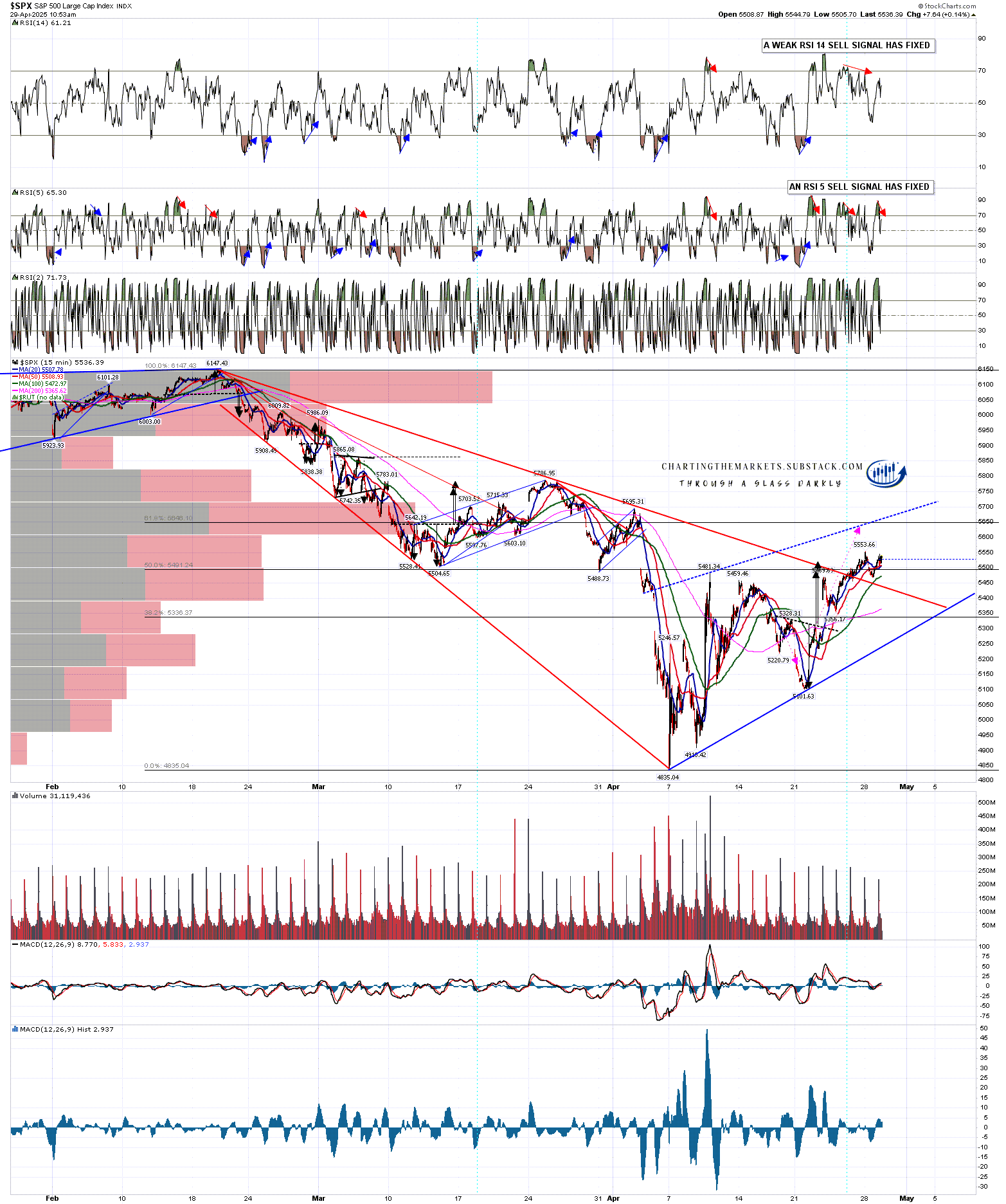 In terms of the ideal bear flag resistance trendline I drew on SPX on 17th April, that’s still looking good and the current rally high is about 110 handles below that (rising) trendline. I think that trendline may well be hit in the next few days and that SPX may well find resistance there. On the 15min chart a weak RSI 14 sell signal and a full RSI 5 sell signal has fixed and there is also a fixed weak hourly sell signal on ES.
