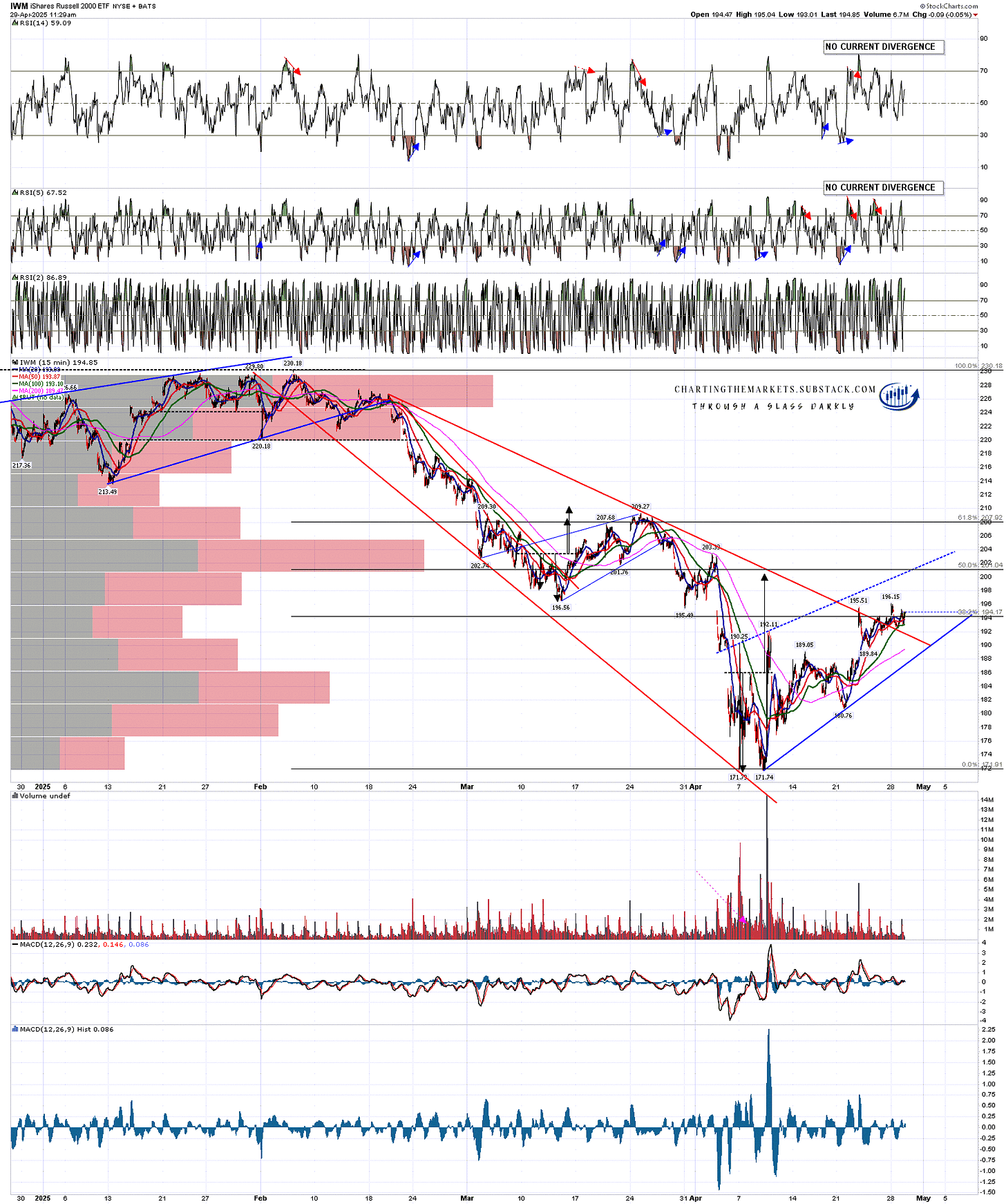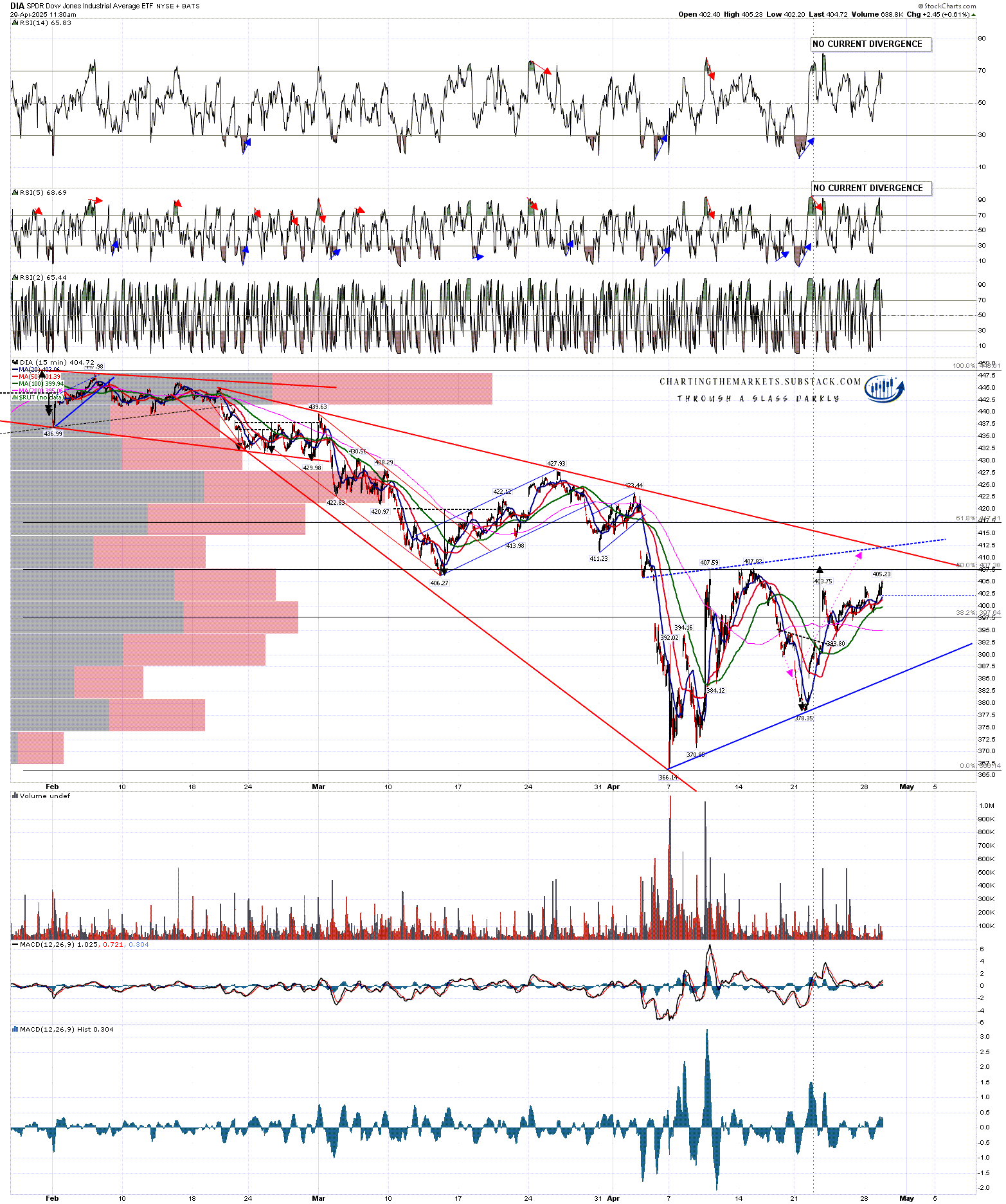 In terms of the ideal bear flag resistance trendline I drew on DIA on 17th April, that’s still looking good and the current rally high is about four handles below that (rising) trendline.