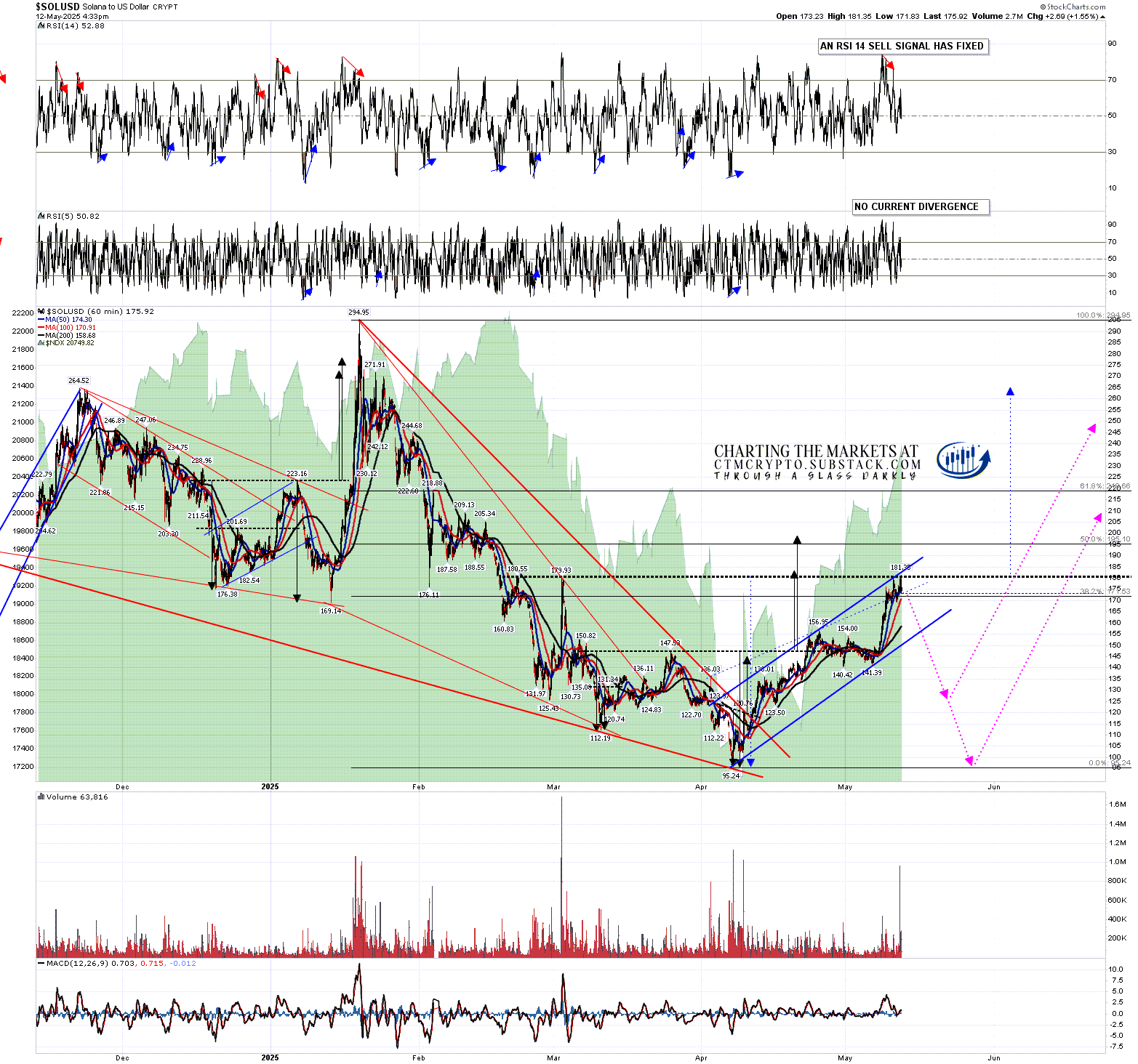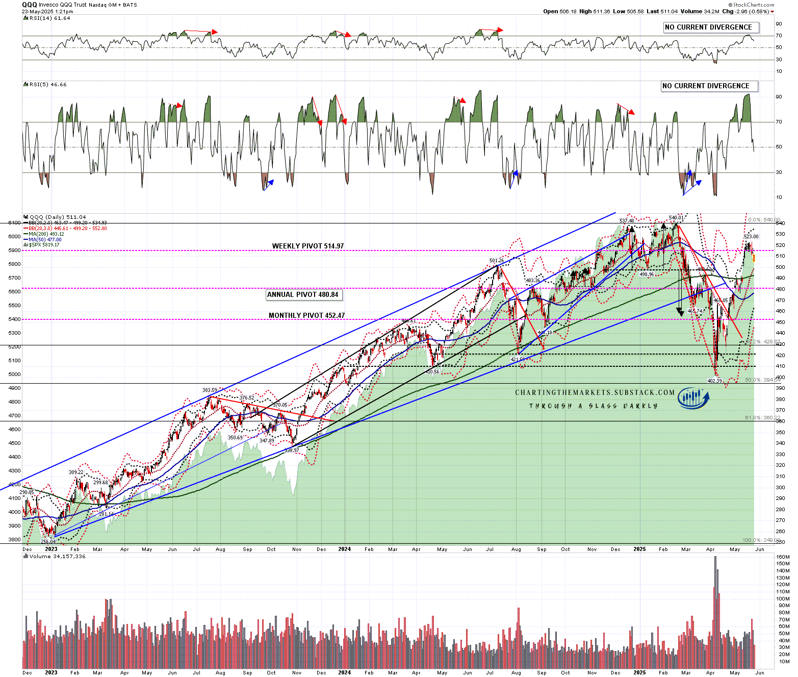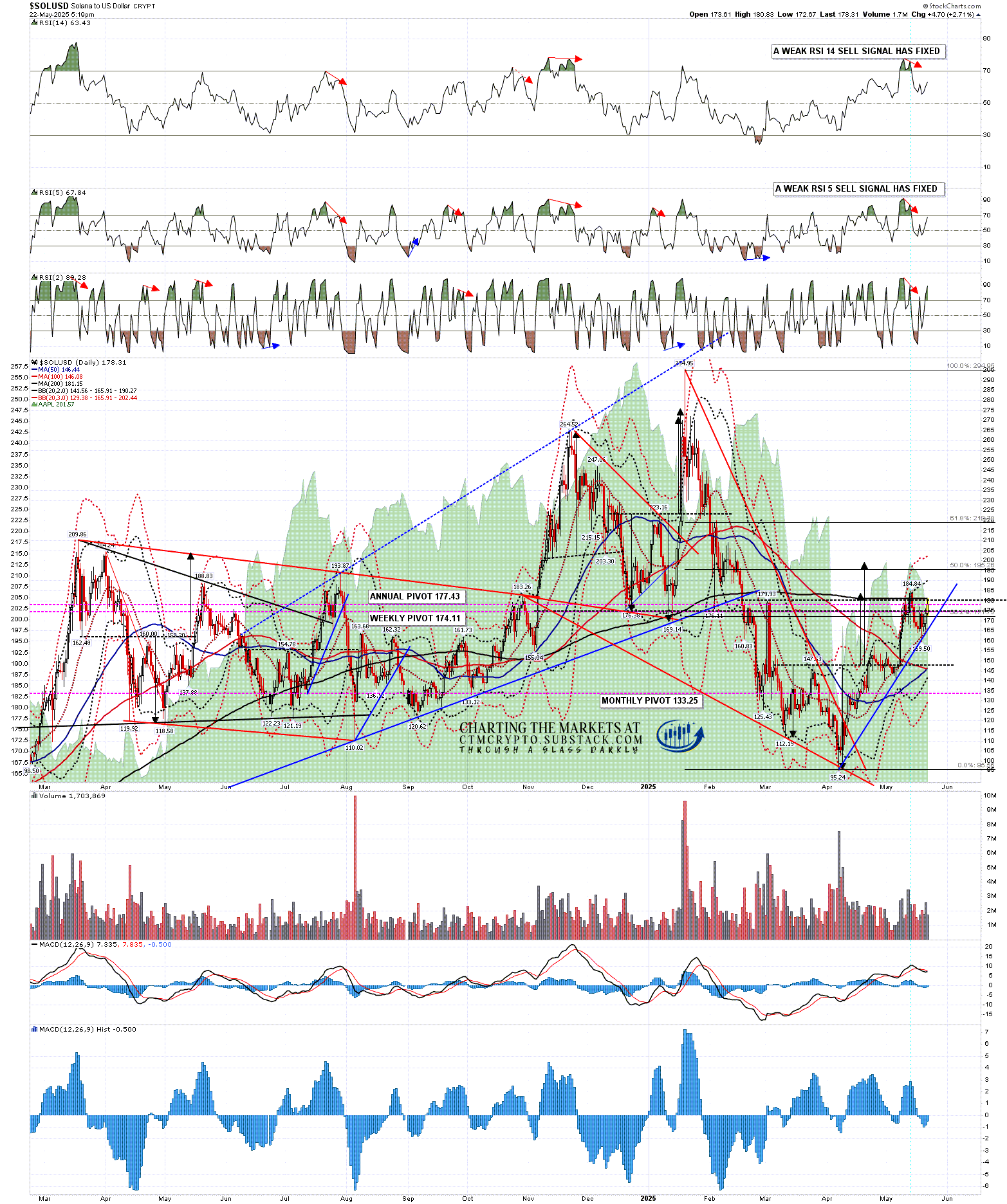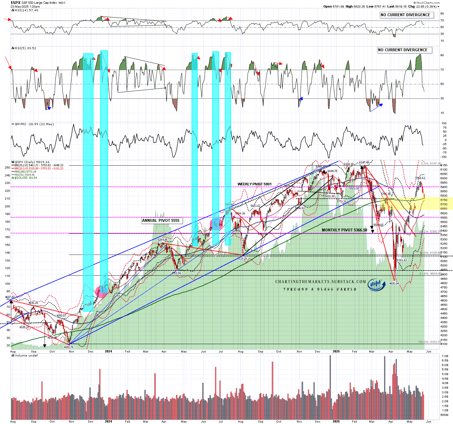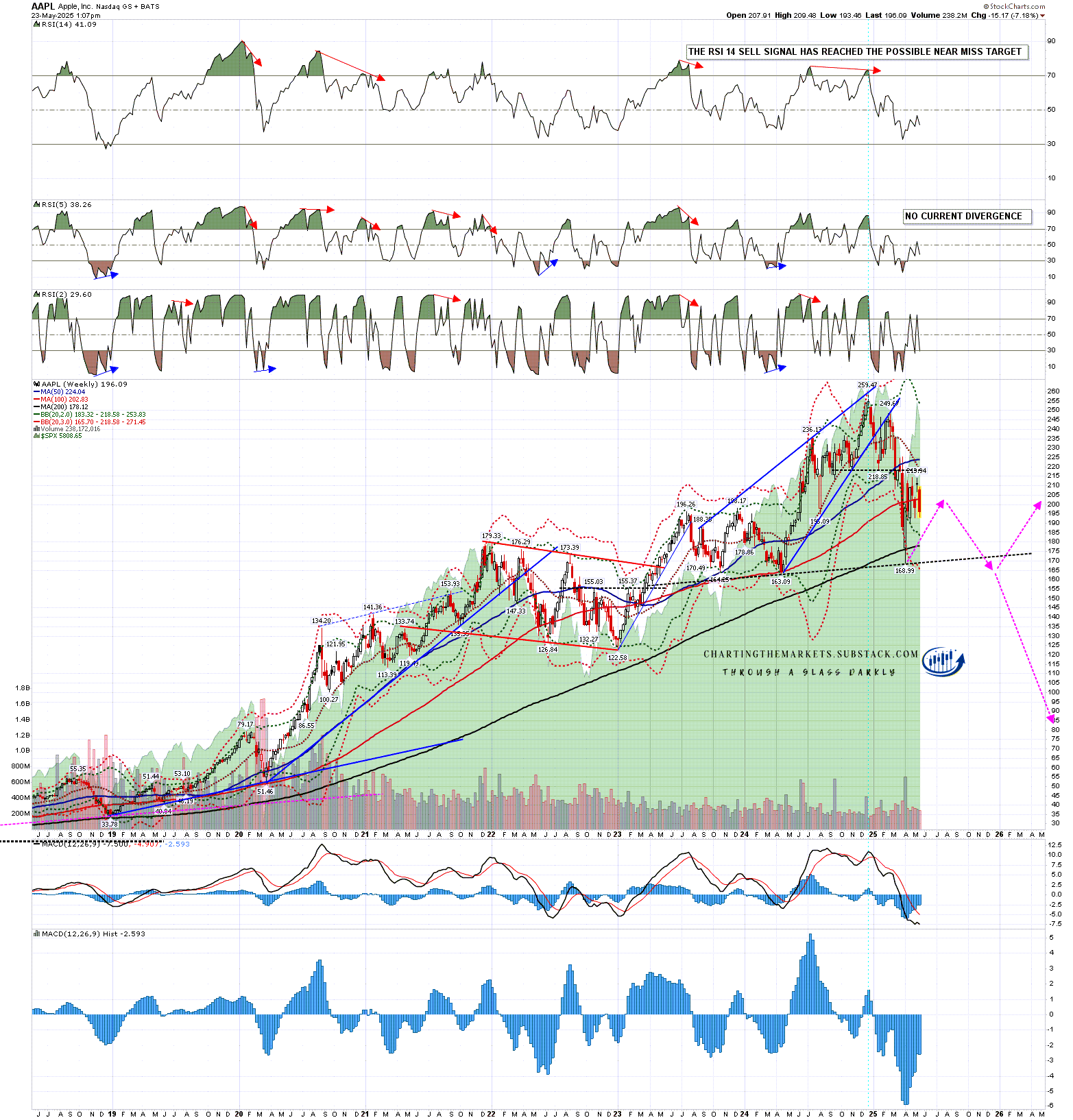 The other thing Trump mentioned this morning was a 25% tariff on iPhones not made in the USA, which I assume would be all of them. This seemed a strange one and he might just have woken up on the wrong side of his random number policy generator but it did remind me that I emailed out an AAPL weekly chart as my Chart of the Day for my substack subscribers earlier this week noting that the arrows I drew on this back in early April to show a possible very large H&S forming are still looking pretty good.