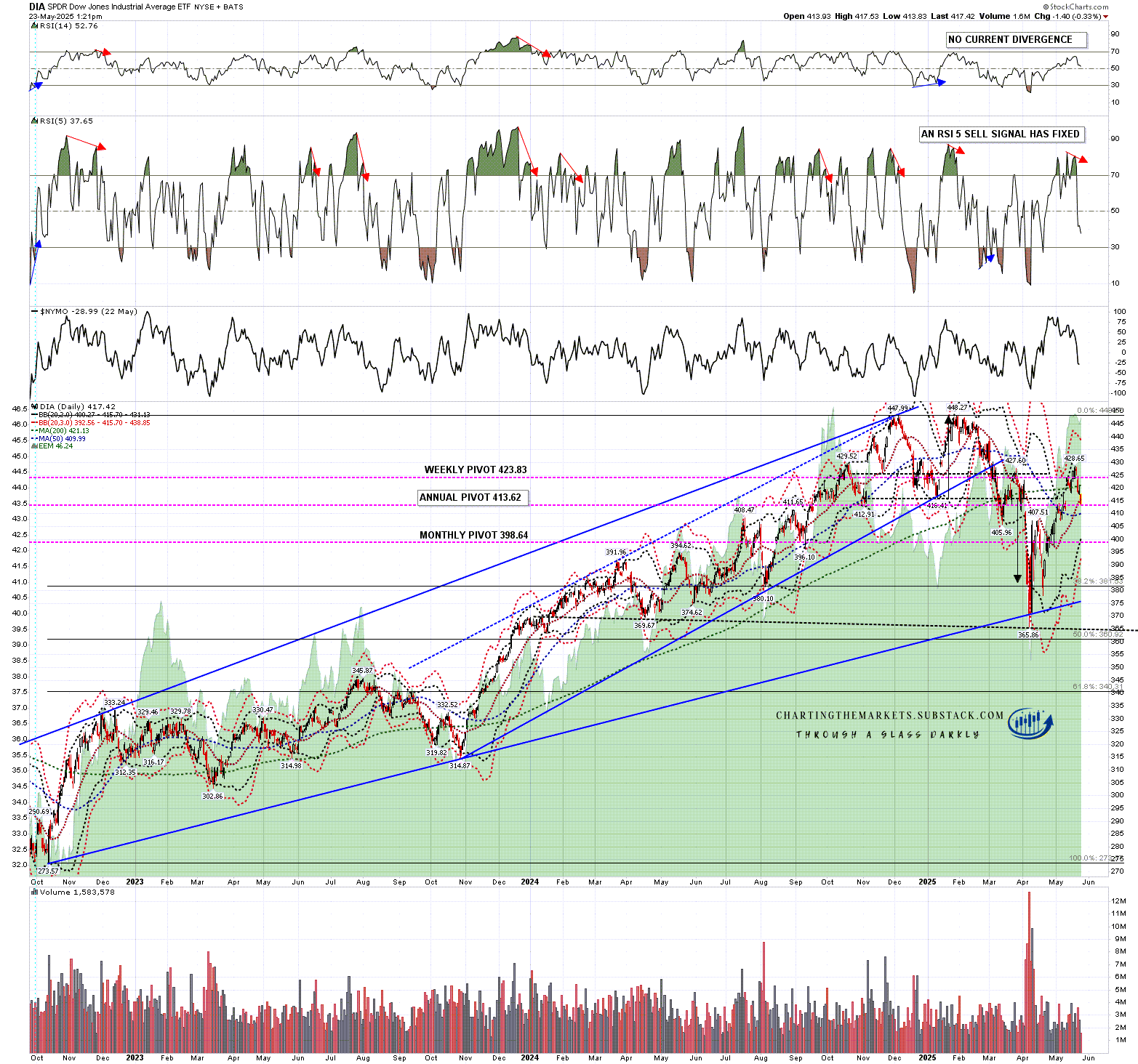DIA has backtested the daily middle band and if it heads a little lower the 50dma is currently in the 410 area. There is some reason to think it might need to go a little lower, as there is a fixed daily RSI 5 sell signal from this last high and it hasn’t reached target yet.