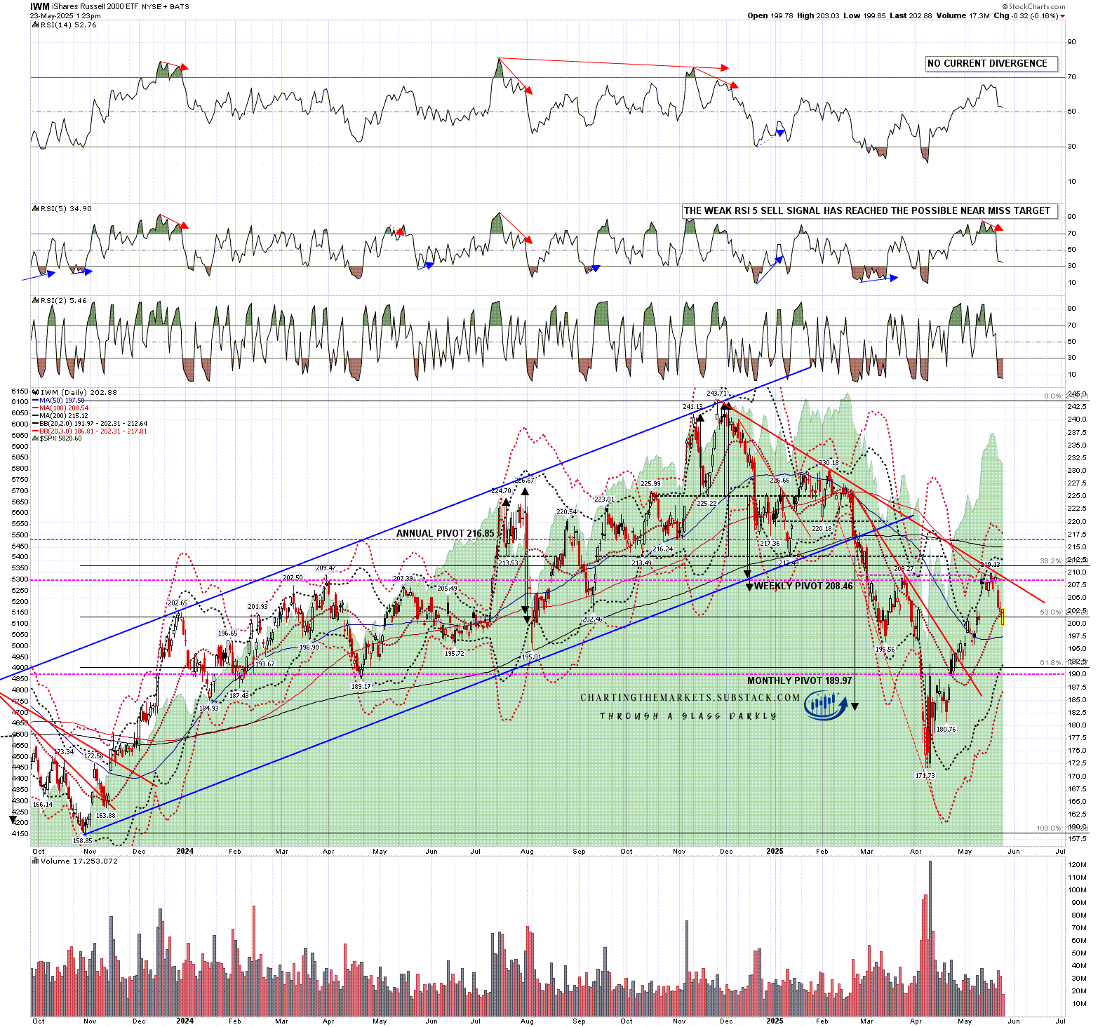 IWM also had a (weak) daily RSI 5 sell signal fix from the last high but that has already reached the possible near miss target. This has been a hard backtest of the daily middle band which has held so far on a daily closing basis. IWM has been the weakest this week, which is to be expected as there have been issues in the bond markets and IWM are the index most vulnerable to higher interest rates.