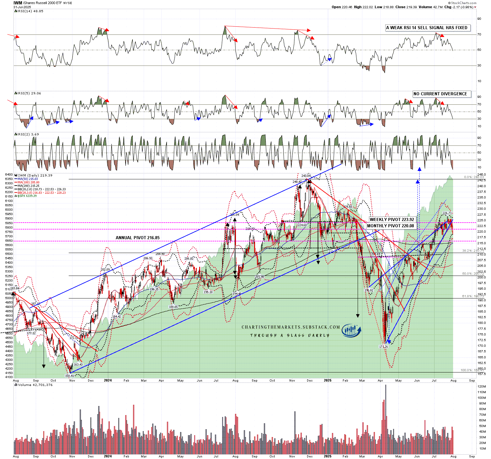 On DIA there was a slight break below the daily middle band at the close on Wednesday and a strong break below yesterday with a close on the daily lower band. An RSI 14 sell signal has fixed and I’m expecting that to make target over coming days and weeks.