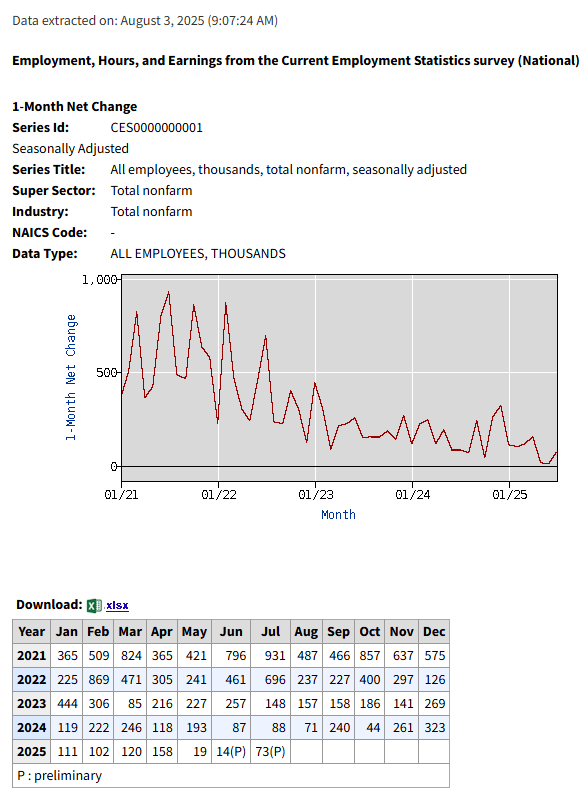 The estimated employment numbers for July weren’t actually that bad, though these are generally revised before reaching a final number two months after the first release, it was the revisions to the numbers for May and June that were bad, reducing May’s number to a final 19k, the lowest final number since 2020 & COVID, and June to a still estimated 14k, currently the lowest number since 2020 but not yet final. The July number at 73k was still not good, as it was the fifth worst number since 2020, with the third and fourth worst numbers in August and October last year.