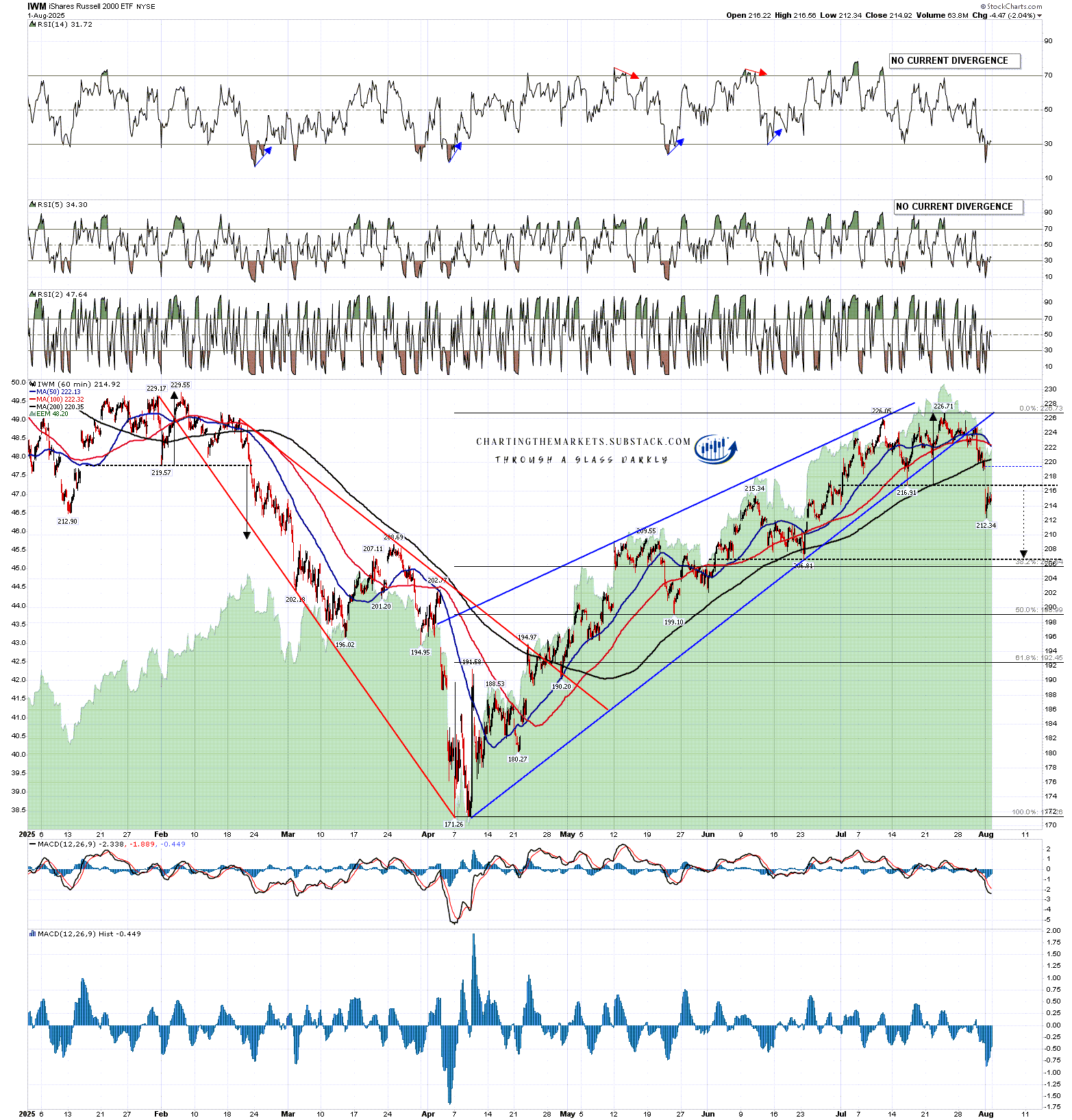 On Friday IWM broke down from the double top there towards a target in the 207 area, just above the possible larger IHS neckline in the 206.81 area. There is a second lower possible IHS neckline in the 199.10 area which is an almost perfect match with a 50% retracement of the move up from the April low.