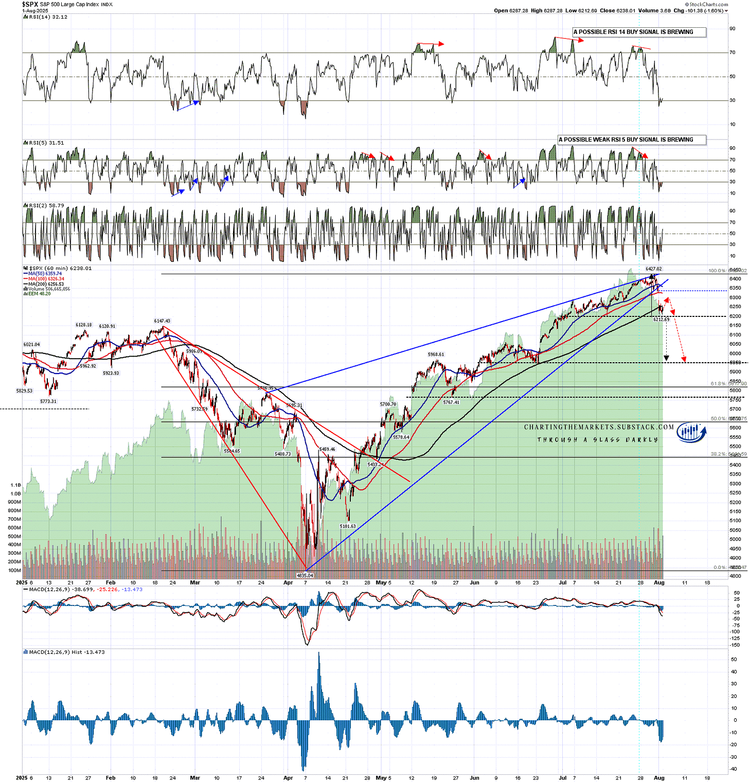 On SPX there was a little double top that reached target on Friday that is too small to mark up on the chart below, but the move down reached the first possible neckline that I had marked on the chart. Possible hourly RSI 14 and RSI 5 buy signals are brewing but not yet fixed.