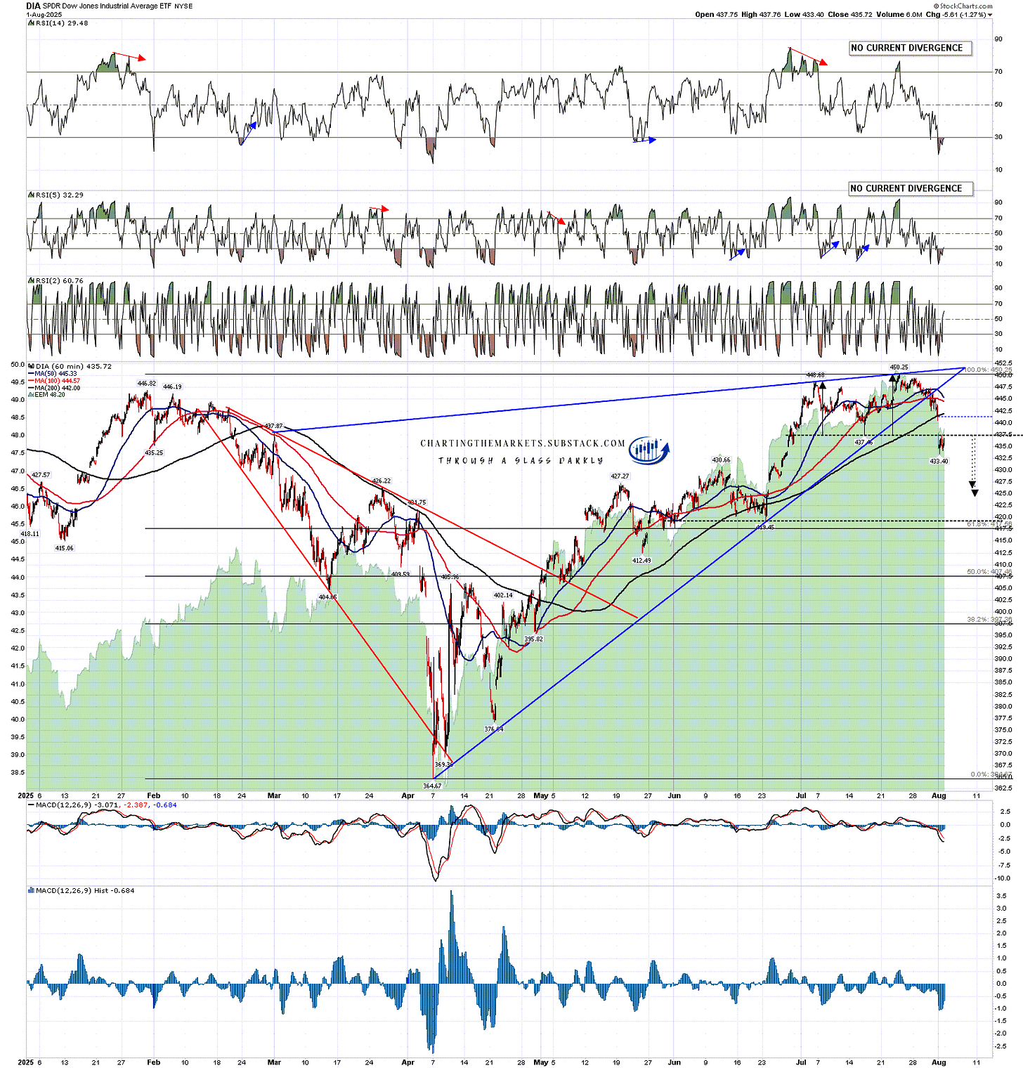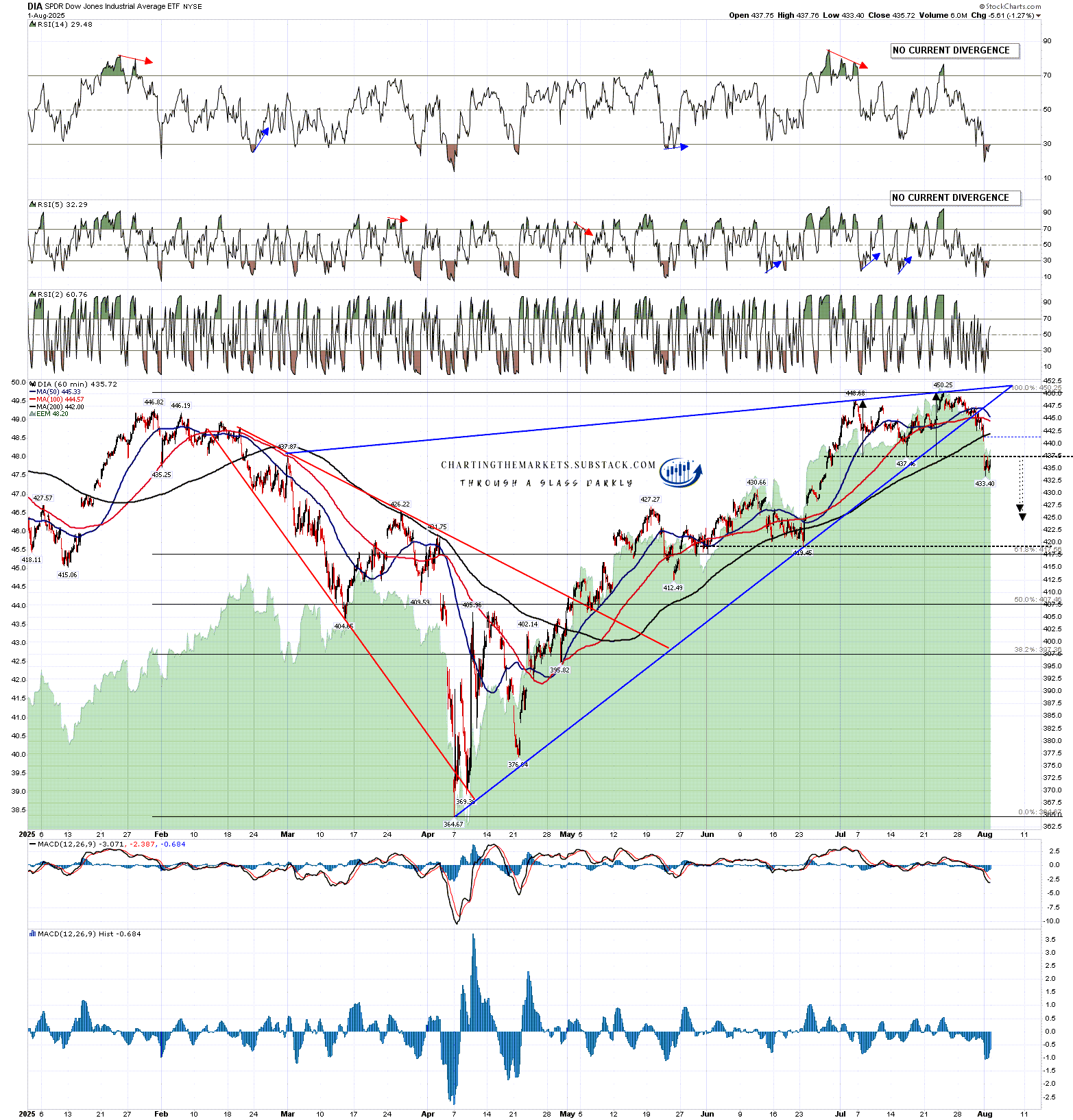 On Friday DIA broke down towards a target in the 424.5 to 426 area. There are obvious target levels a bit lower with larger possible H&S necklines in the 419.45 and 412.49 areas.