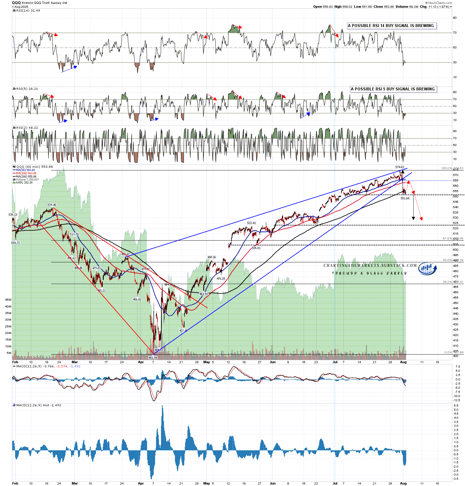 On QQQ the move down on Friday also reached the first possible neckline that I had marked on the chart. Possible hourly RSI 14 and RSI 5 buy signals are brewing but not yet fixed.