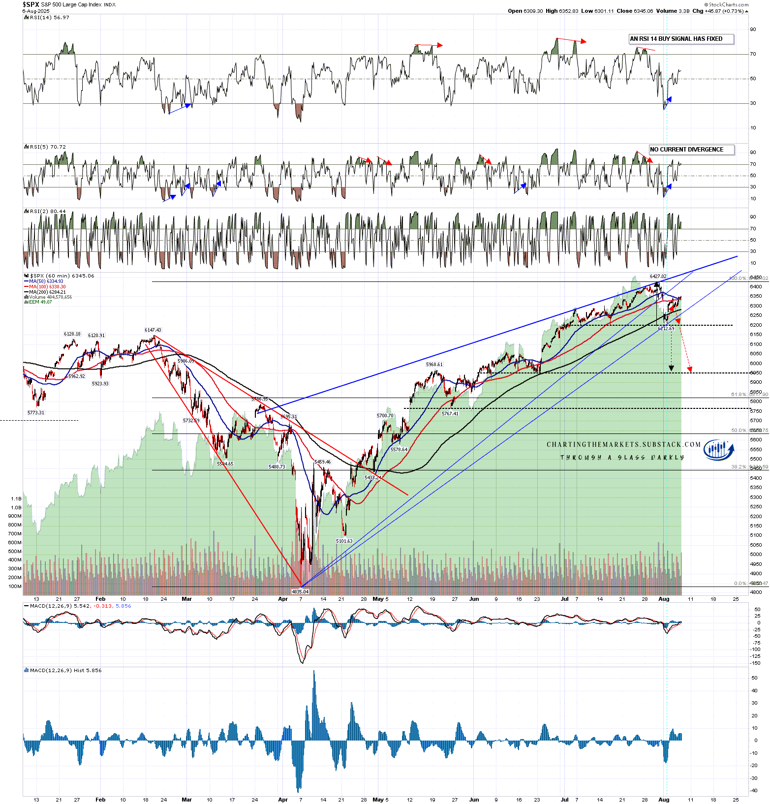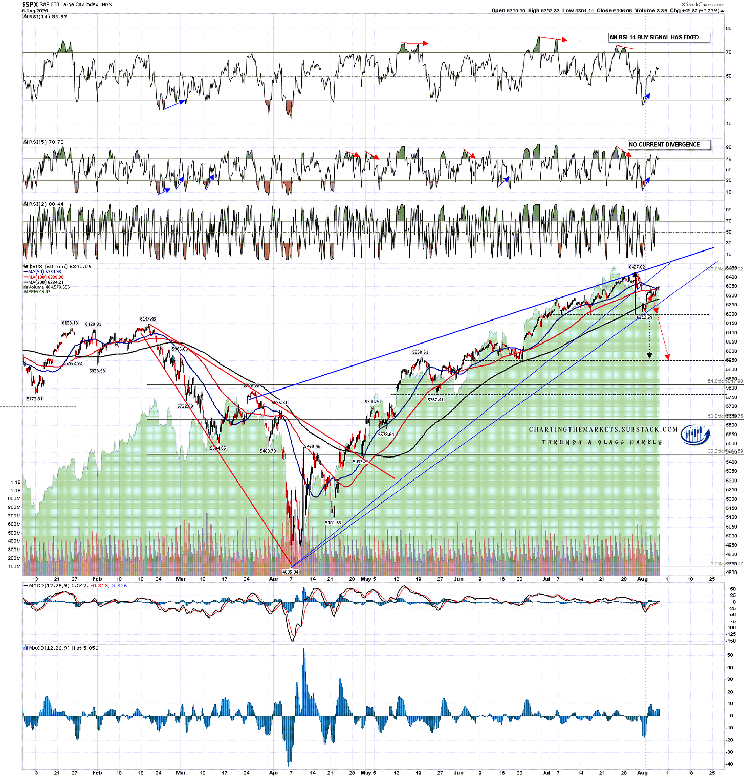A retest of the all time high would be at 6427.02 of course and if we see continuation on to the resistance trendline then that is currently in the 6485 area. If we see that trendline tested again then I would redraw the wedge support trendline through Friday’s low at 6212.69 as shown below.