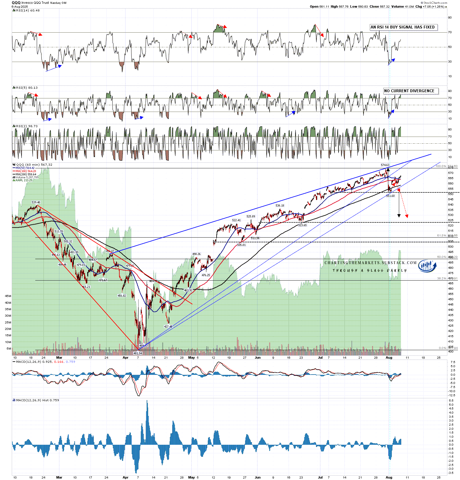 A retest of the all time high would be at 547.63 and if we see continuation on to the resistance trendline then that is currently in the 595 area. If we see that trendline tested again then I would redraw the wedge support trendline through Friday’s low at 551.68 as shown below.