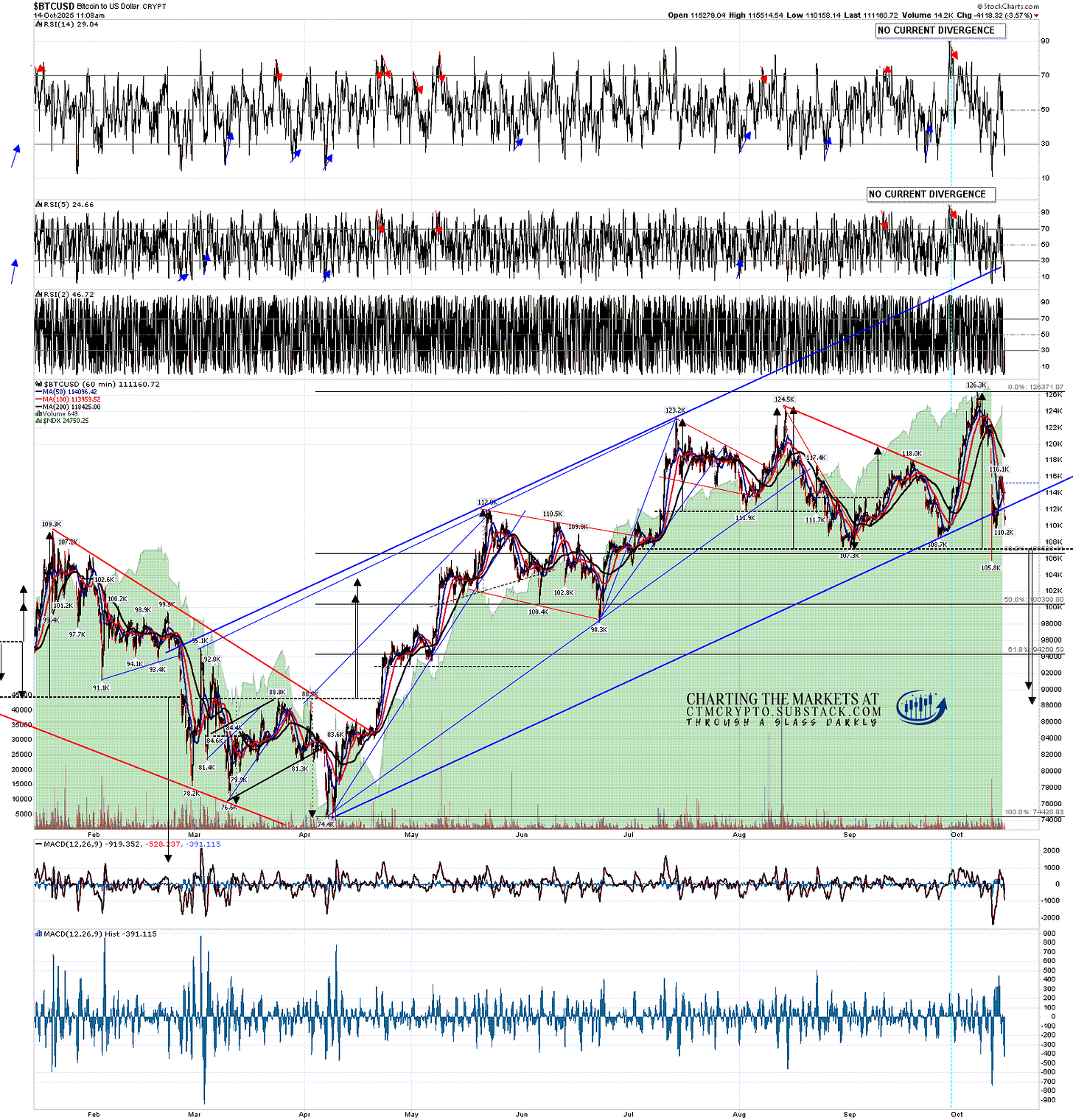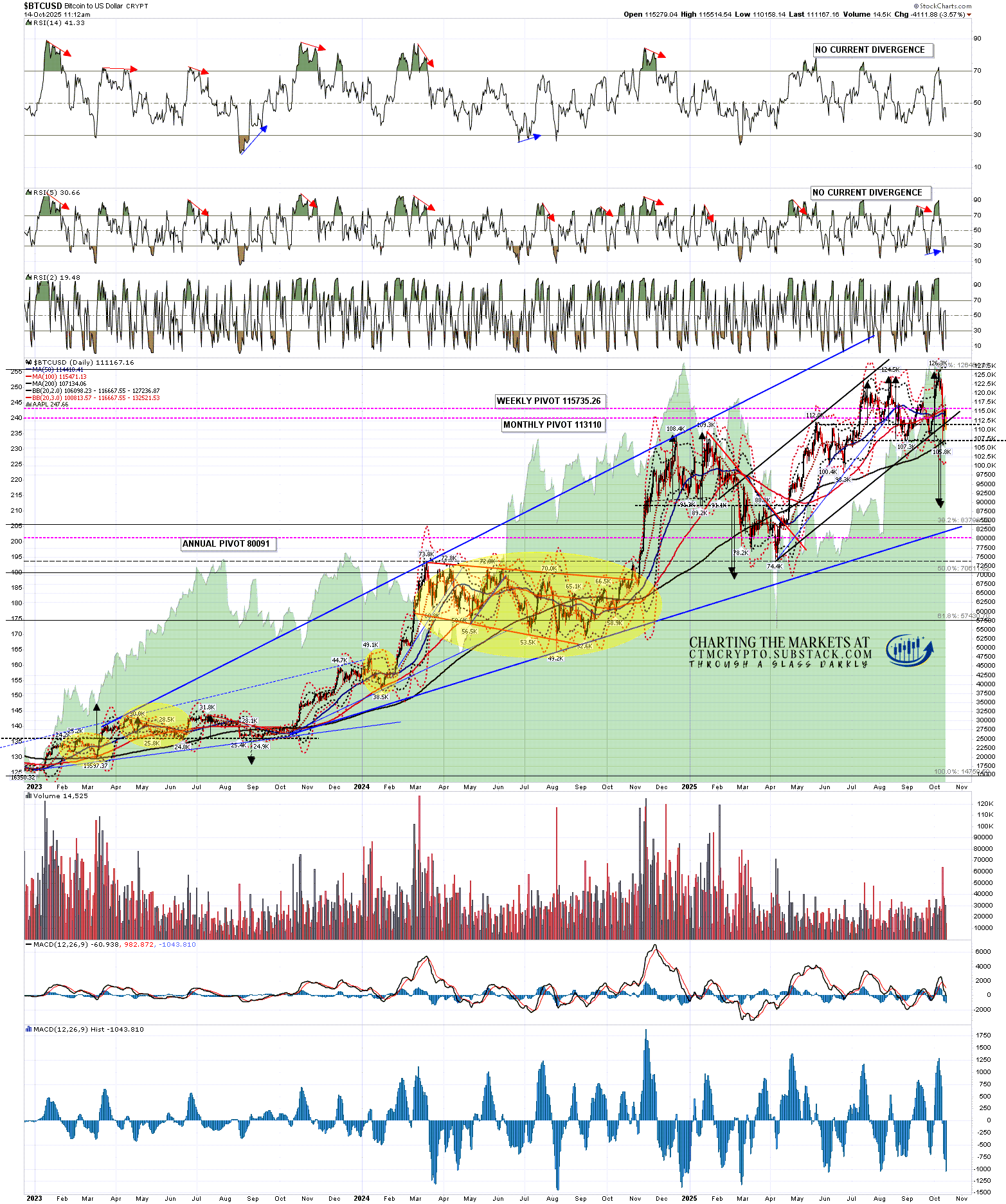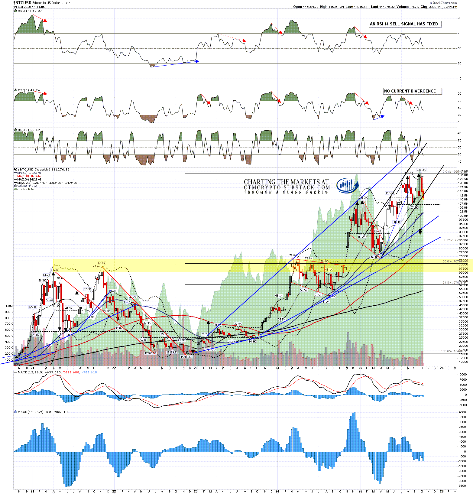 There was an aggressive test of weekly middle band support on Friday, currently at 113,147, with a close above at the end of the week, so that support is holding so far.