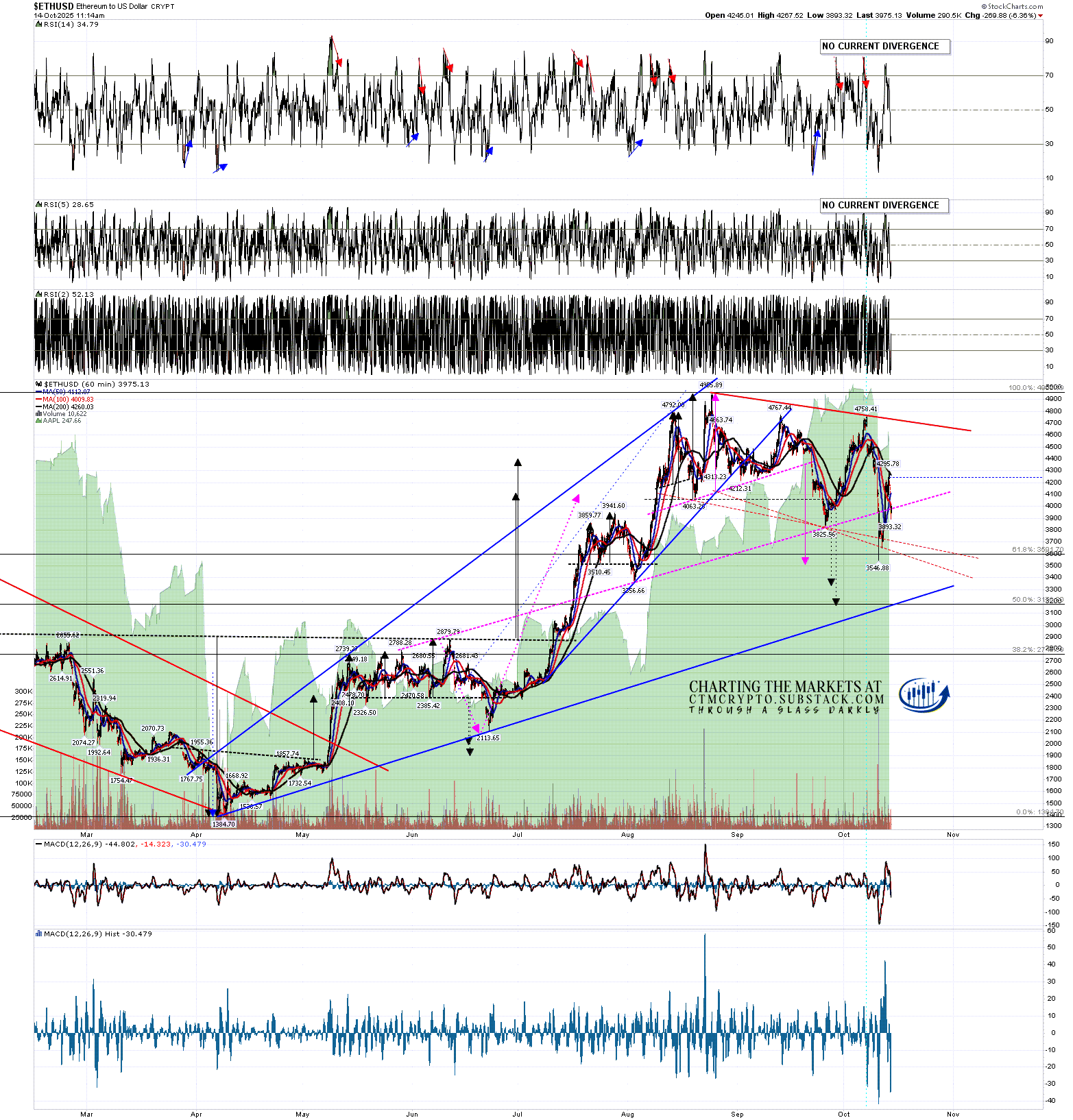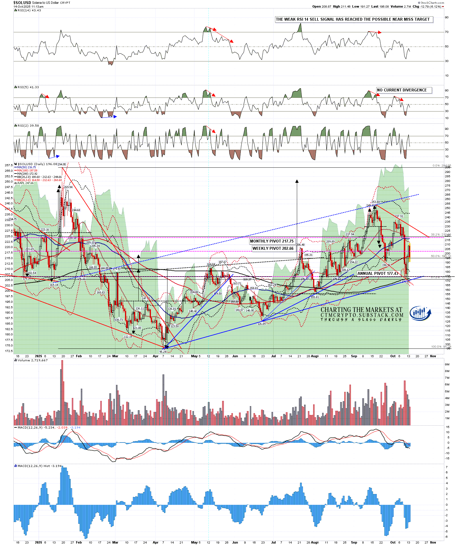 Ethereum and Solana never retested their highs so in effect we are still looking at the same retracement that I was speculating about starting on Tuesday 16th September. There was of course an H&S on Ethereum that broke down soon after with a target in the 3500 area, and the low on Friday was at 3546.88, close to that target.