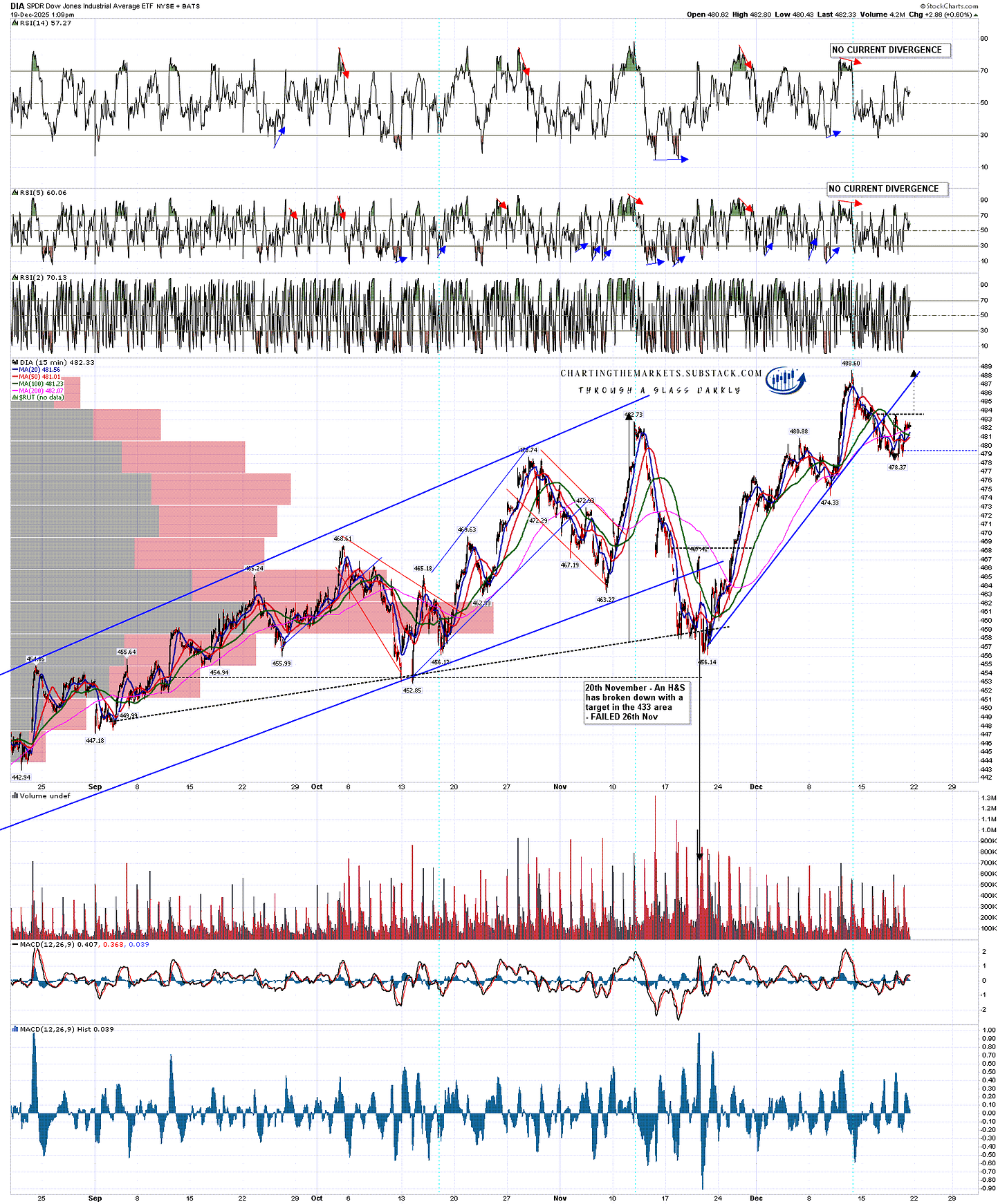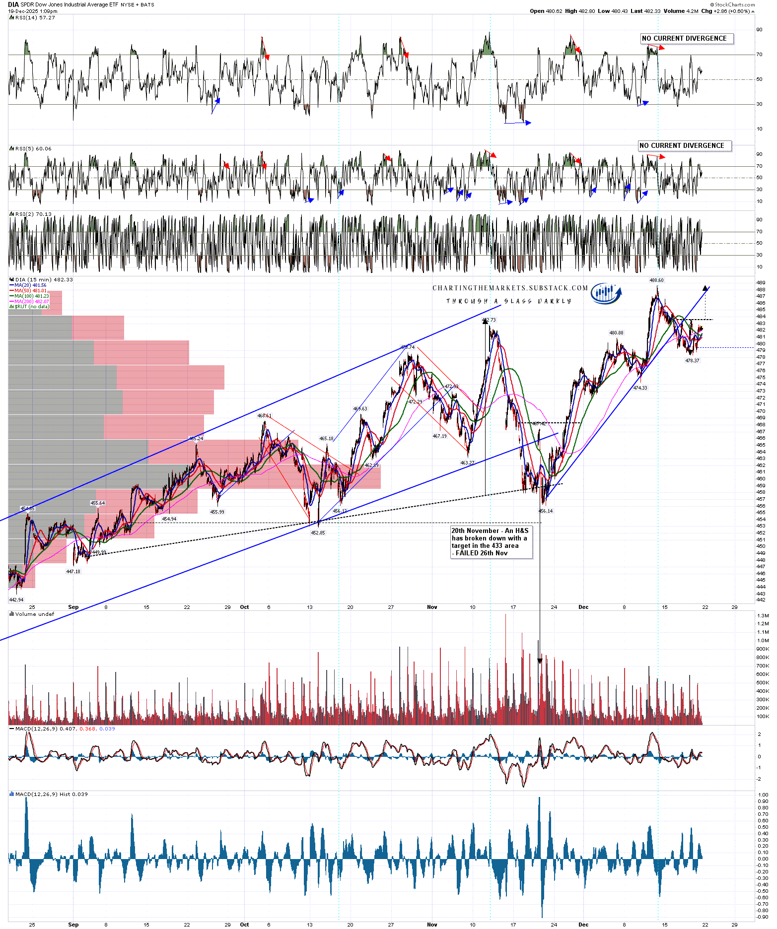 On IWM there was a small IHS on IWM, not marked up but shown on the RTY_F chart I posted on Tuesday. That made target and a sharply downsloping (but decent quality) IHS has formed from the lows and broken up with a target in the 255.75 area, close to the December high at 257.34.