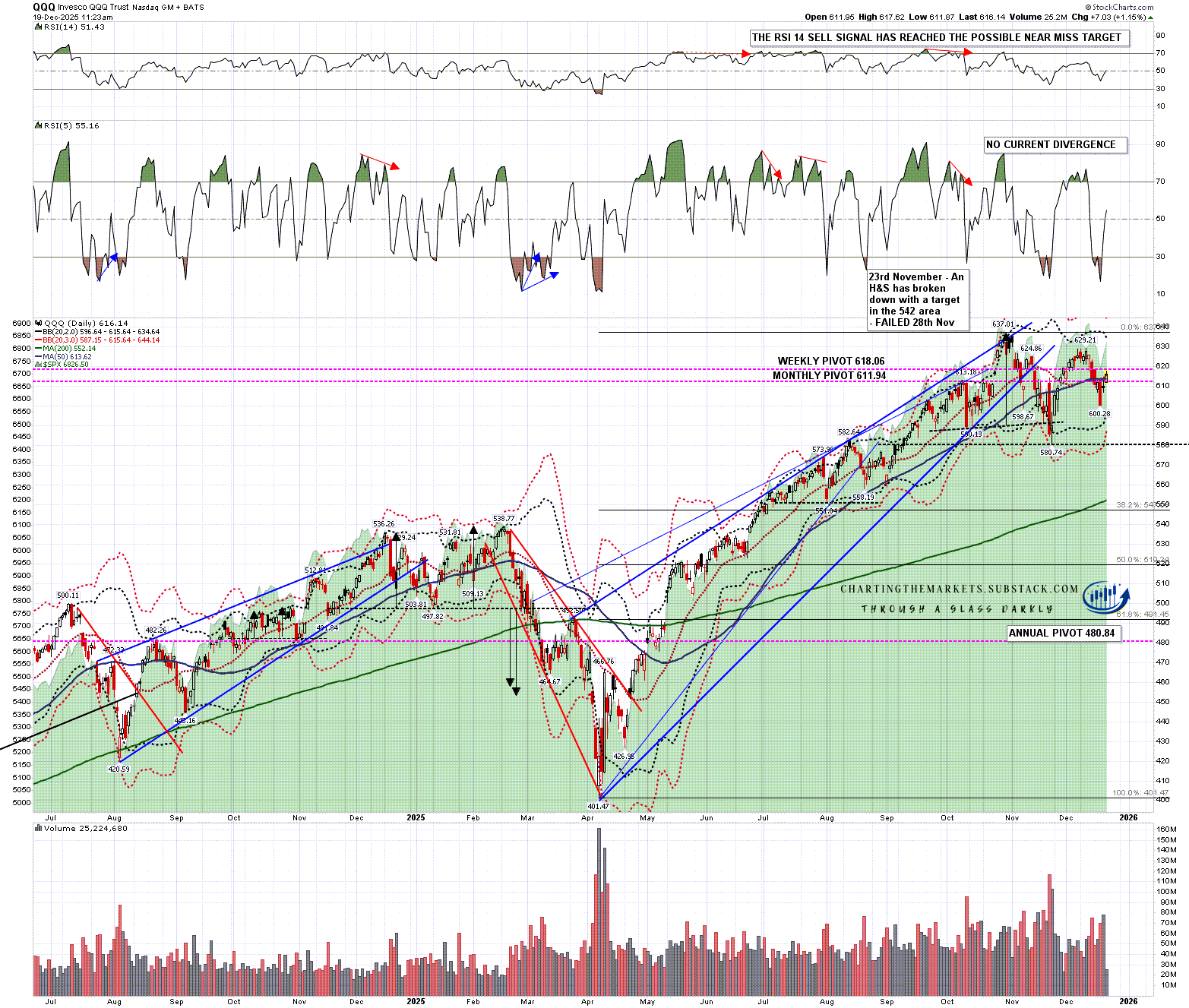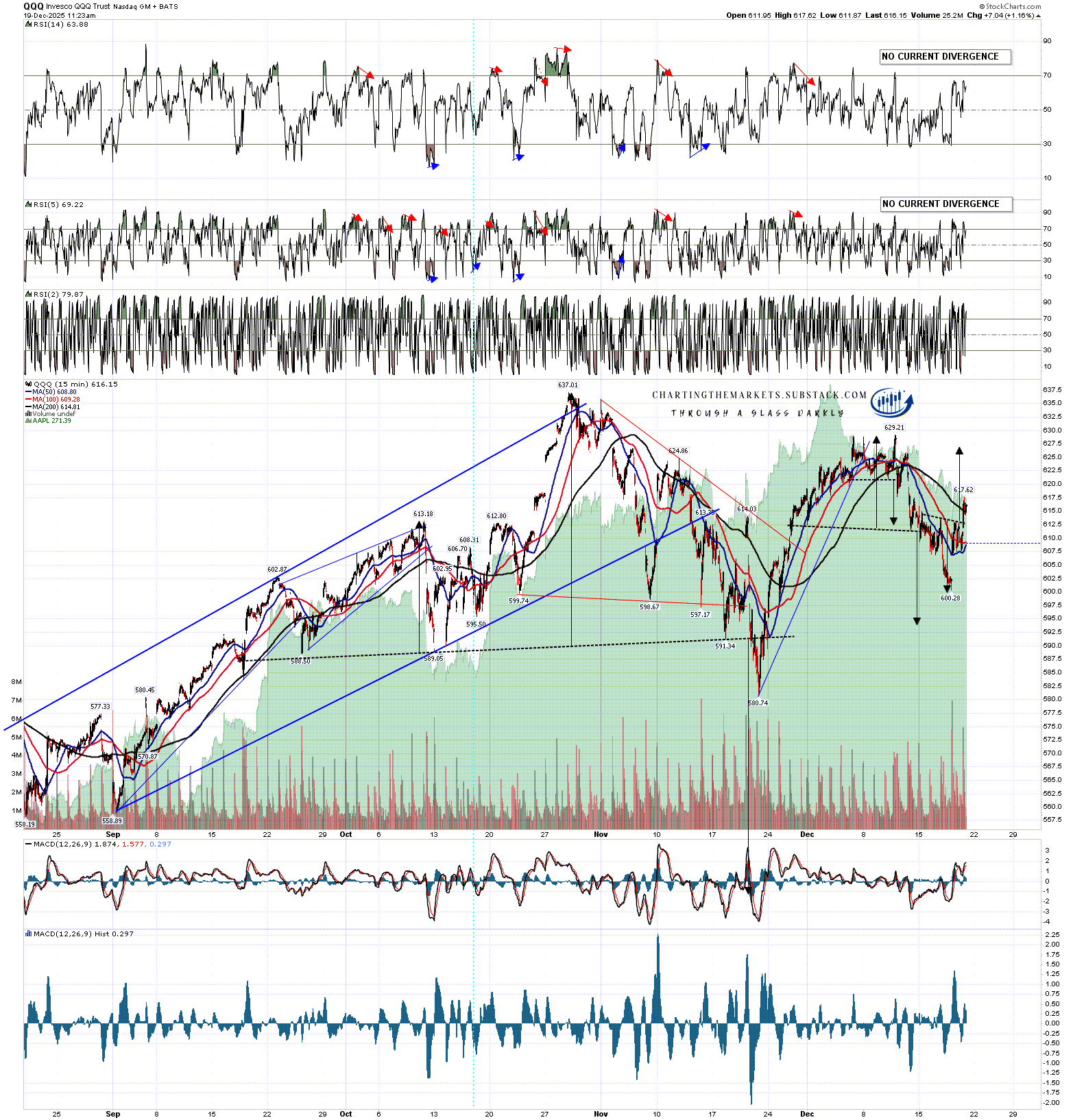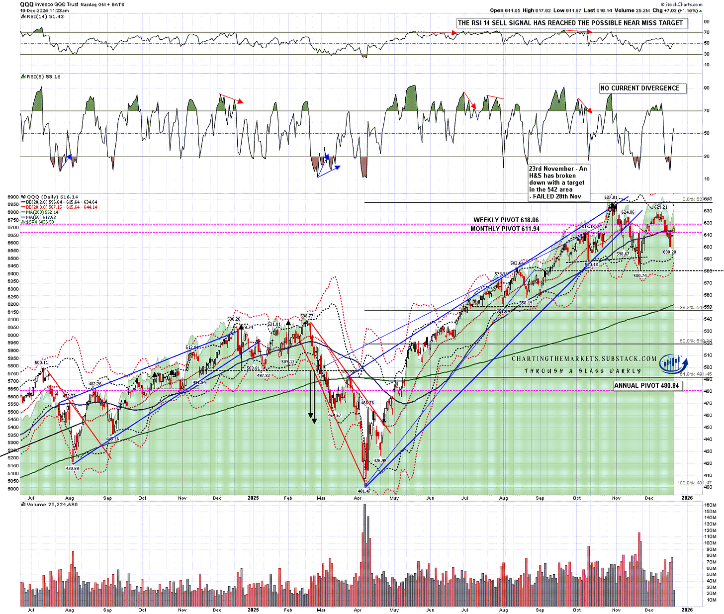 On QQQ the sequence was similar, with the initial double top that reached target, but a larger H&S that failed on a break over the right shoulder high this morning, and an IHS that has formed and broken up with a target in the 627.50 area, close to the December high at 629.21.