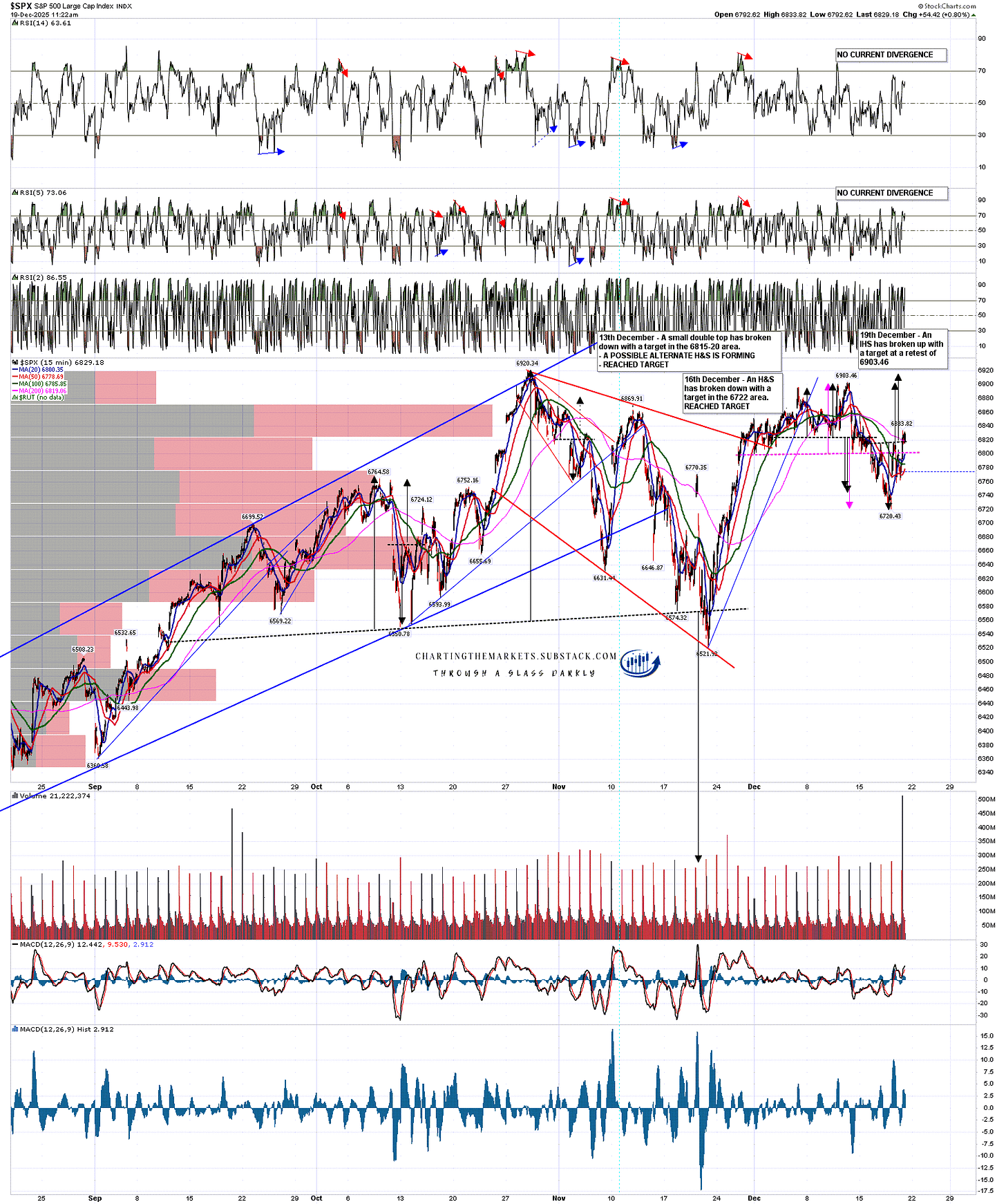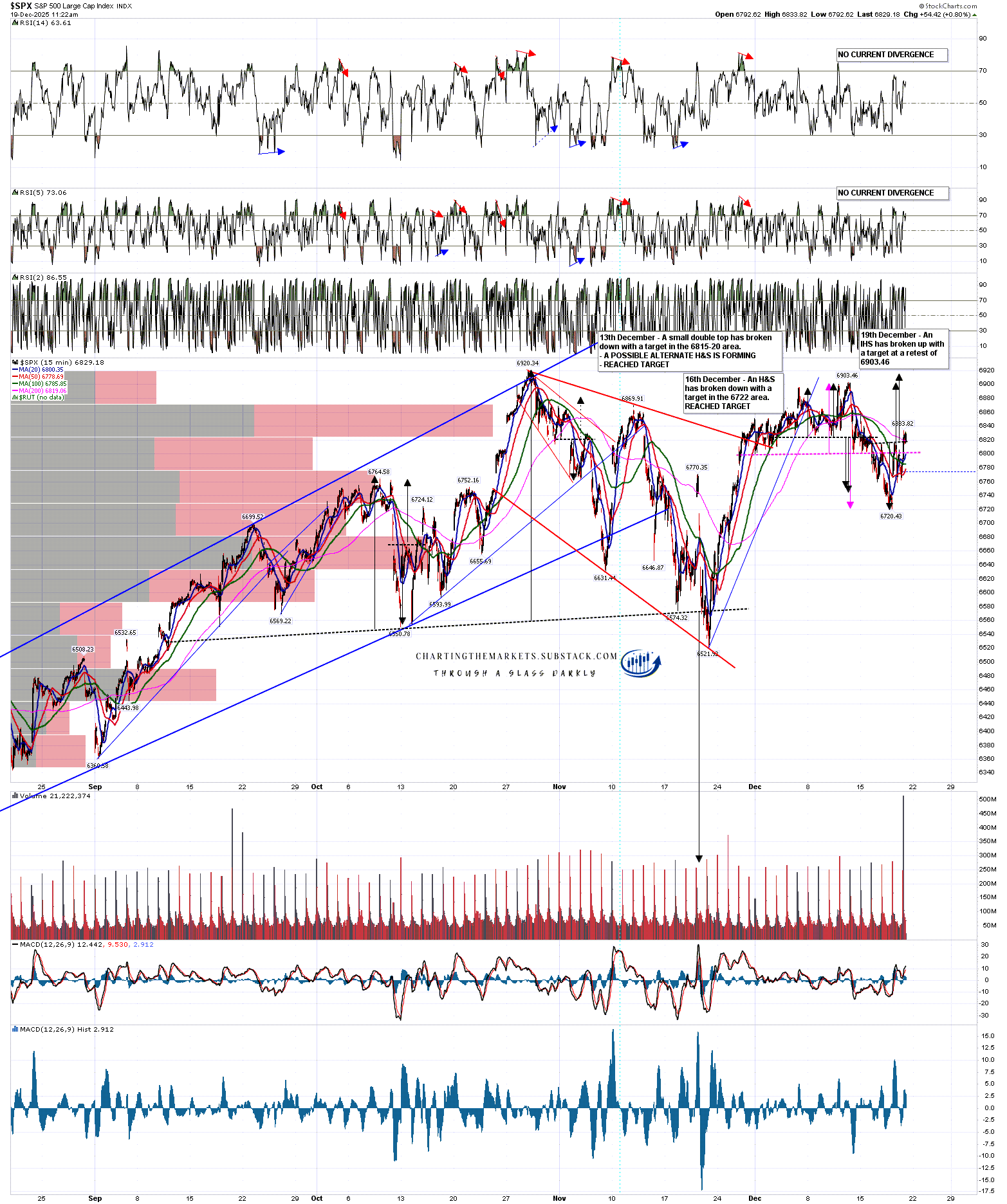 From the December high at 6903.46 a small double top formed and reached target in the 6815-20 area. As that was playing out a larger H&S formed and broke down with a target in the 6722 area and that reached target at the low on Wednesday.