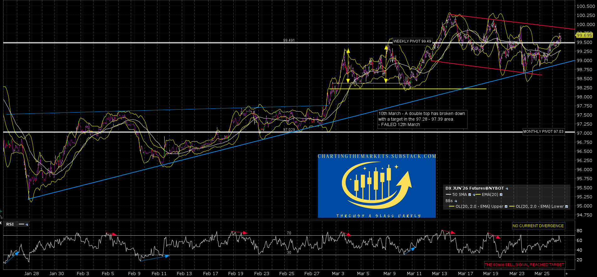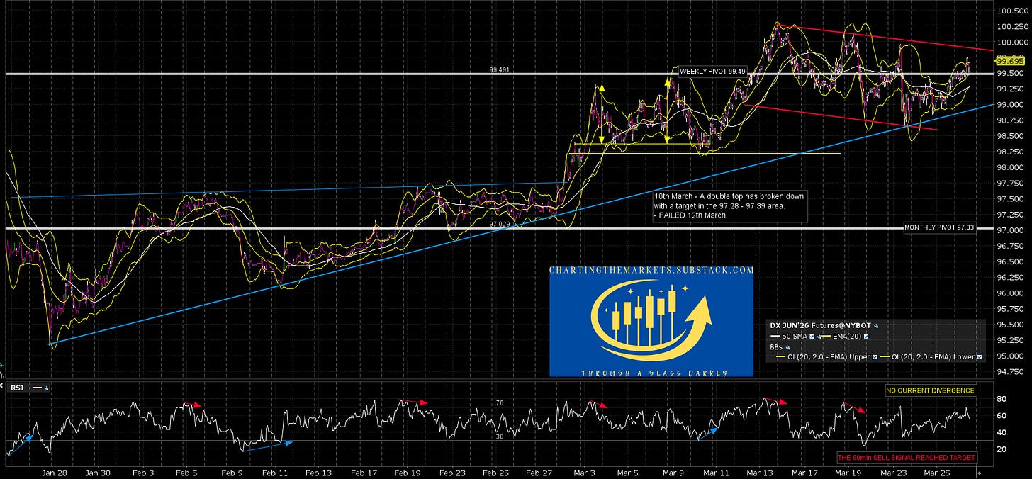 On the DX hourly chart there is a decent quality bull flag formed from the March high that could be ready to break up, but the fixed daily RSI 5 sell signal has me wondering whether this needs another leg down first.