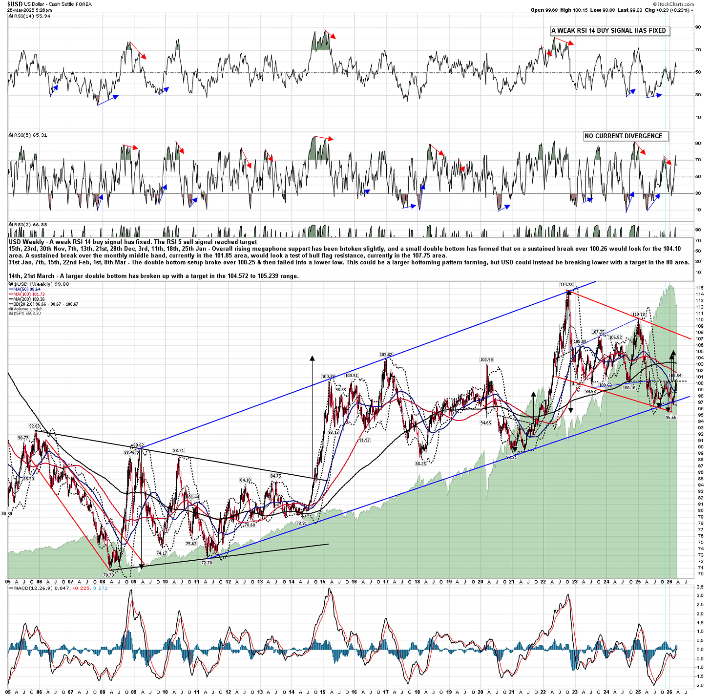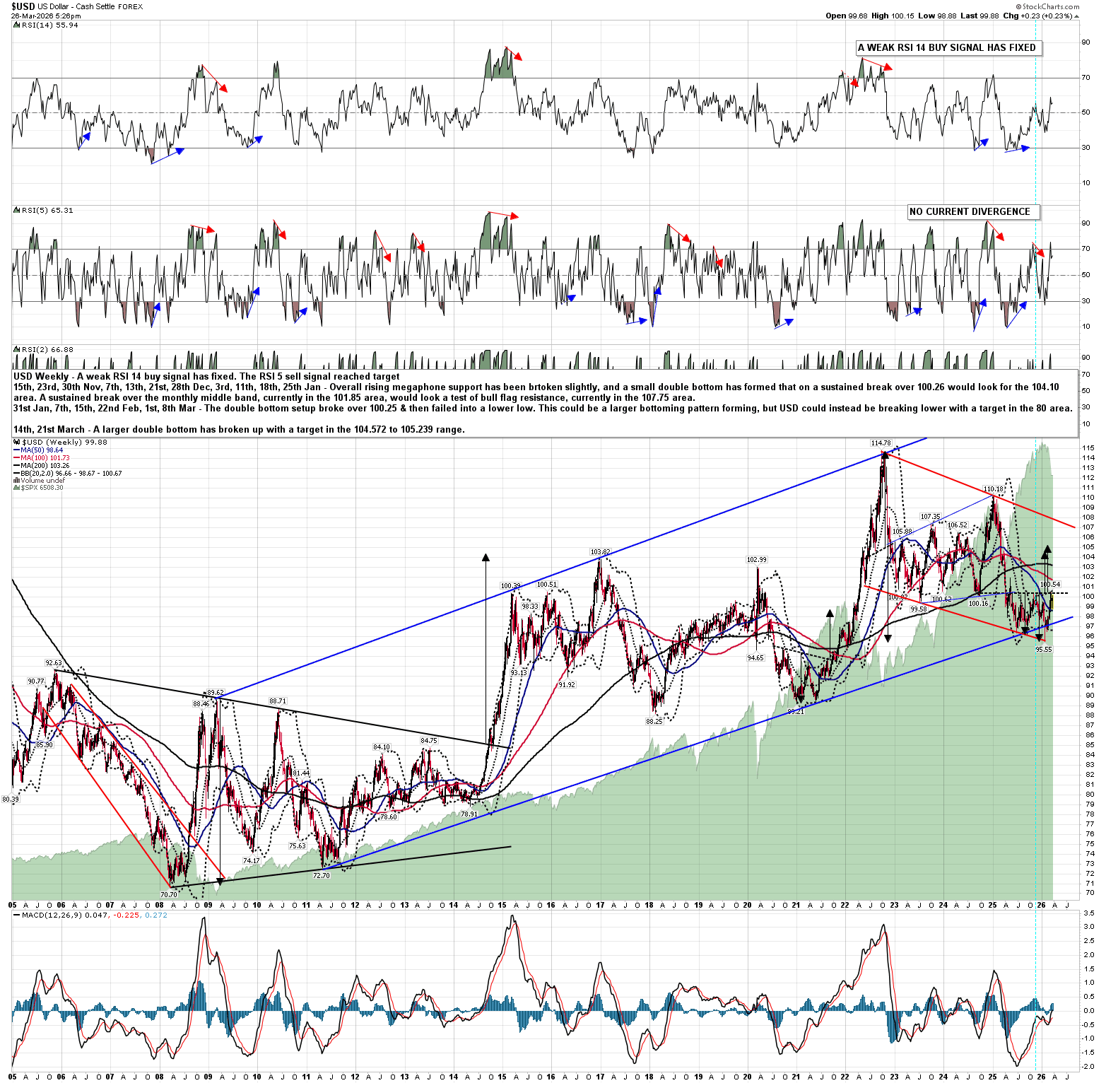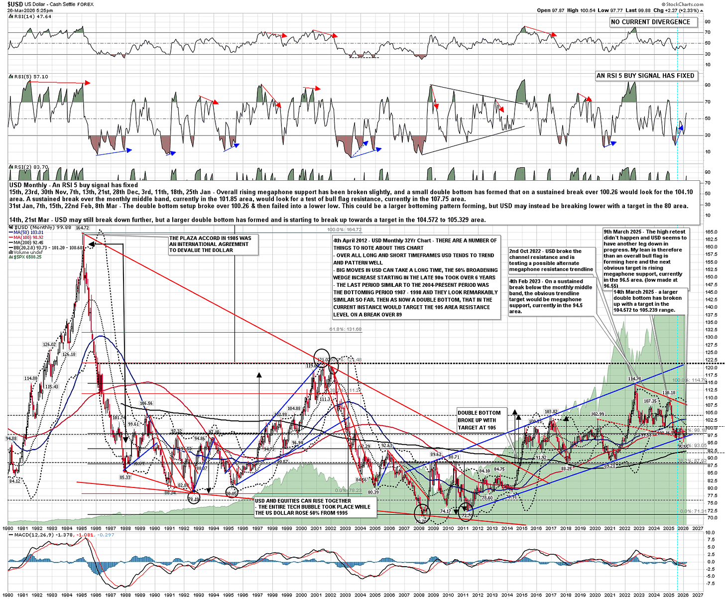 So let’s have a close look at this very bullish setup on USD now. Looking at my main USD monthly chart going back to 1980 you can see that the bear market from the 1984 high at 164.72 fell in a falling wedge into the 2008 low at 70.70. From there there has been a rally forming a high quality rising megaphone into the 2022 high at 114.78, slightly under the 50% retracement of that bear market which would have been at 117.71. This looks like a large bear flag setting up a retest of the low, over the next decade or two, in the 70.70 area.