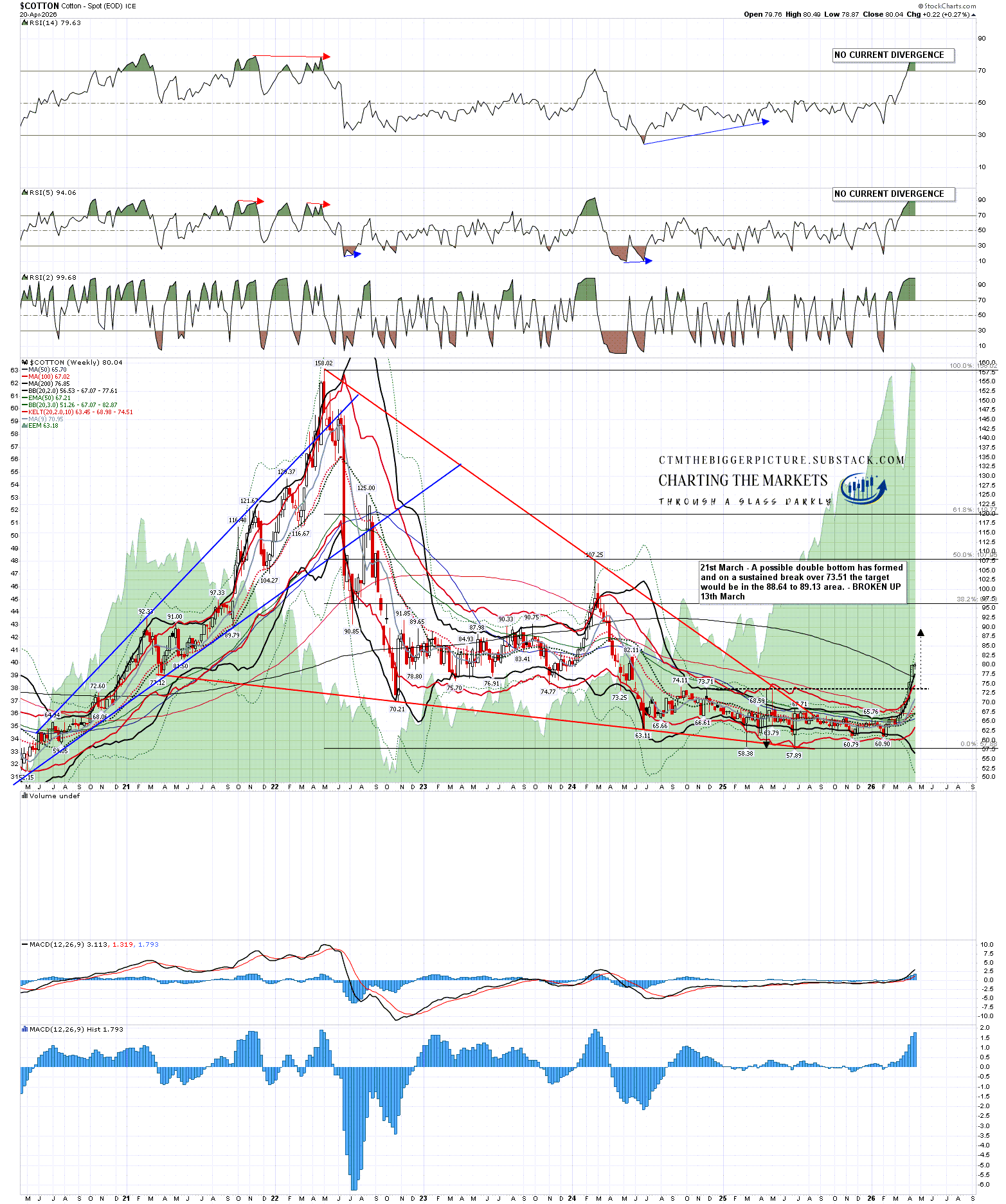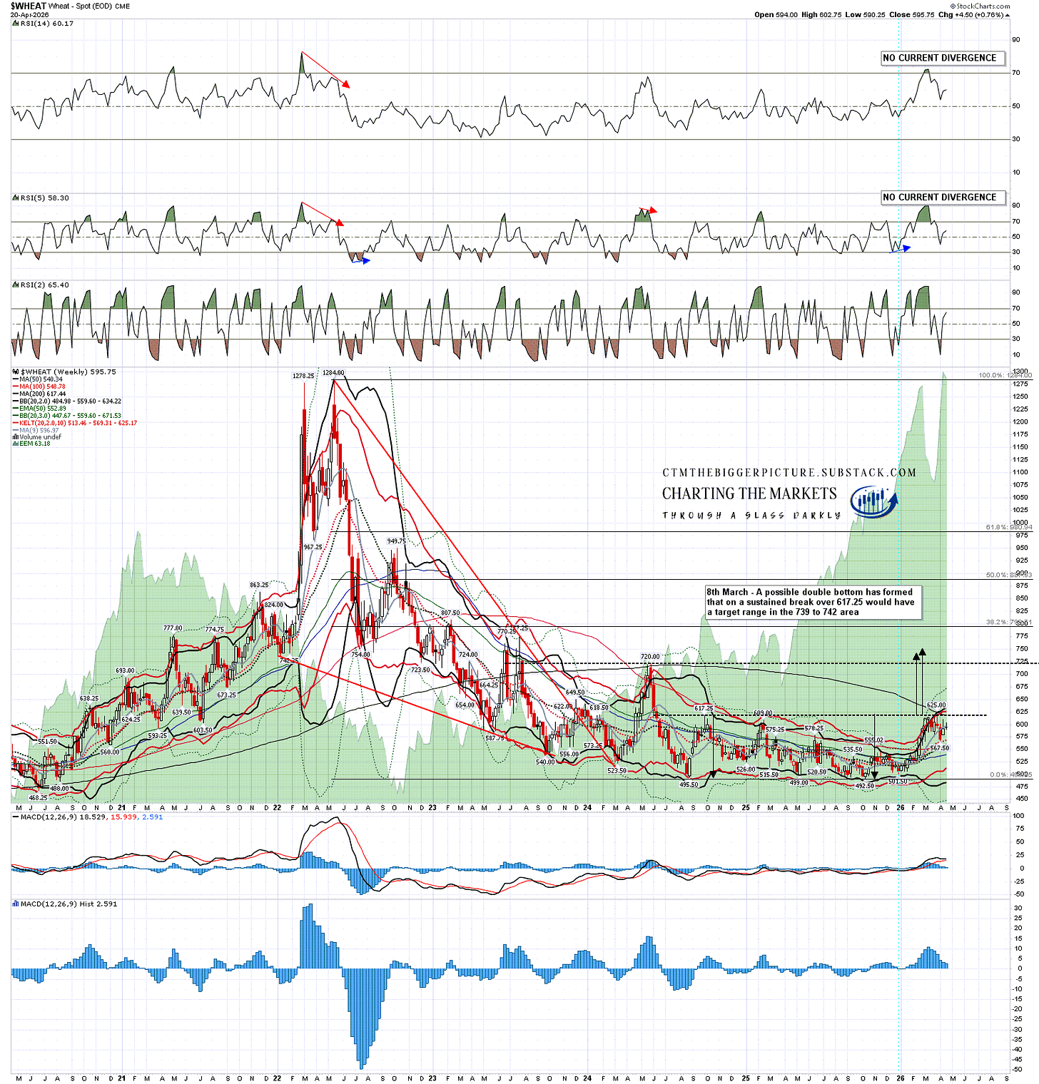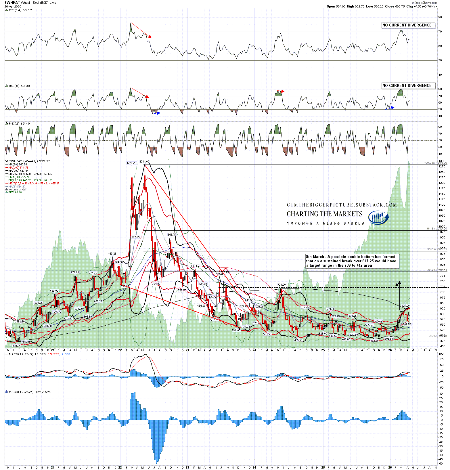 To a large extent these setups are just routine retracements of their big moves down from the major highs made in 2022, and they are very possibly not dependent on a further escalation of the Iran War. These moves may already be baked in from the disruption of the last few weeks affecting the crops to be harvested over the next few months.