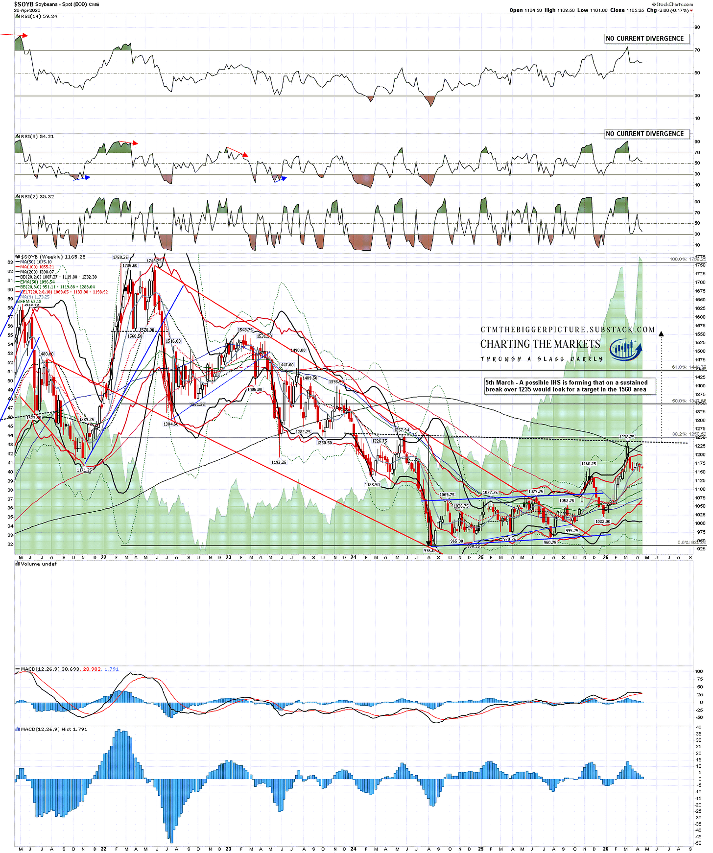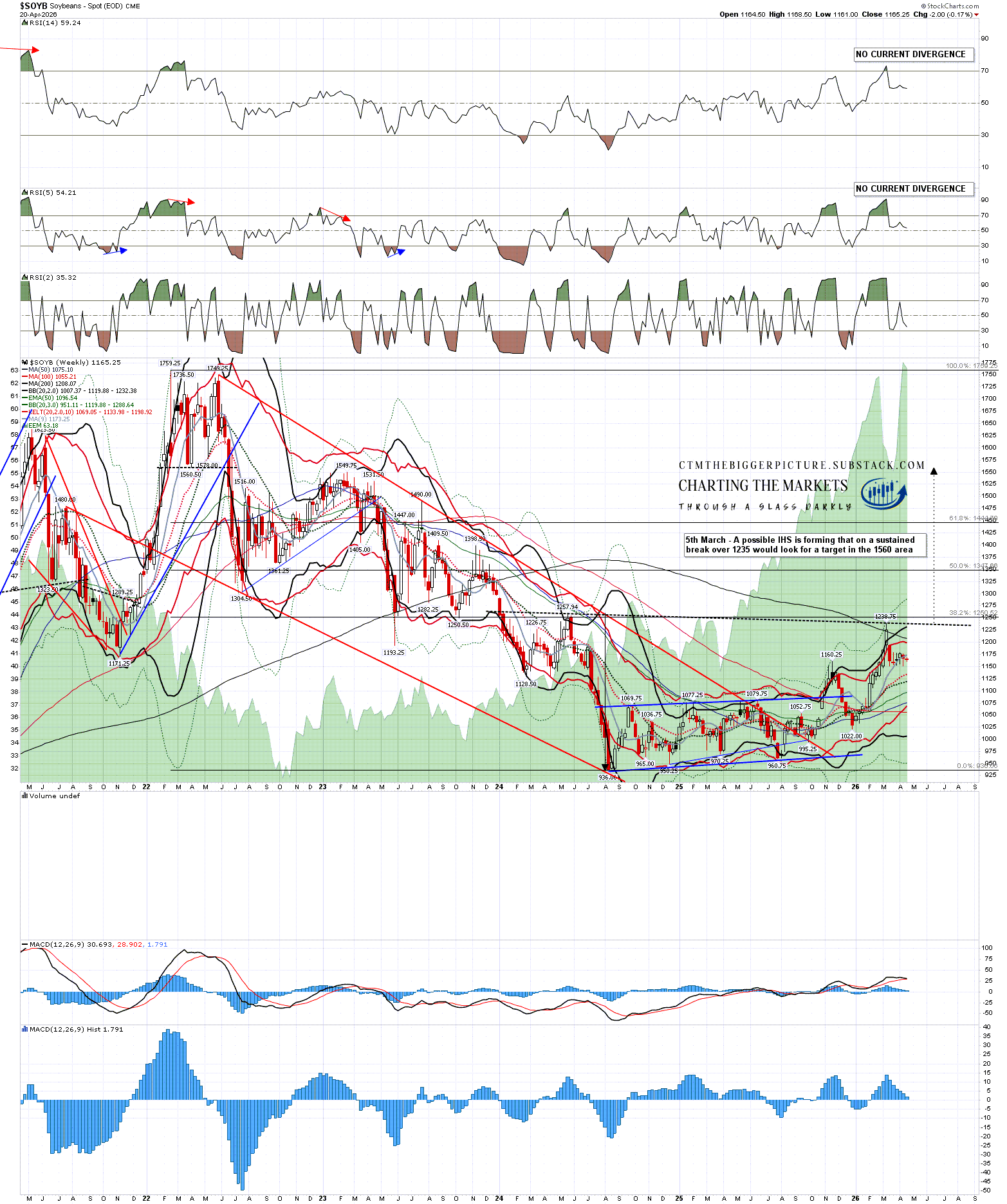 Soybeans are the only one of these crops that had not formed a double bottom by the start of this year. I had been expecting one as a clear bear flag channel was forming for over a year from the low in 2024. That bear flag broke up though, came close to a retest of the possible IHS neckline at 1257.94, and has since been pulling back in what may well be an IHS right shoulder. A sustained break over 1235 would look for a target in the 1560 area, close to a 76.4% retracement of the falling wedge from the 2022 high into the low in 2024. There is no obvious path higher from there.