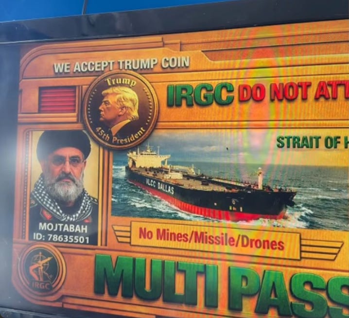 In term of the current ceasefire and the Strait of Hormuz almost everything about the ceasefire is obscured by a fog of confusion, but what does seem clear is that the Strait of Hormuz remains under Iranian control, that when it is open at all they are charging a stiff toll on all vessels passing through the Strait, and are insisting on payment in either Yuan or Cryptocurrency. In case you were wondering, they are welcoming payment in Trump Coins: