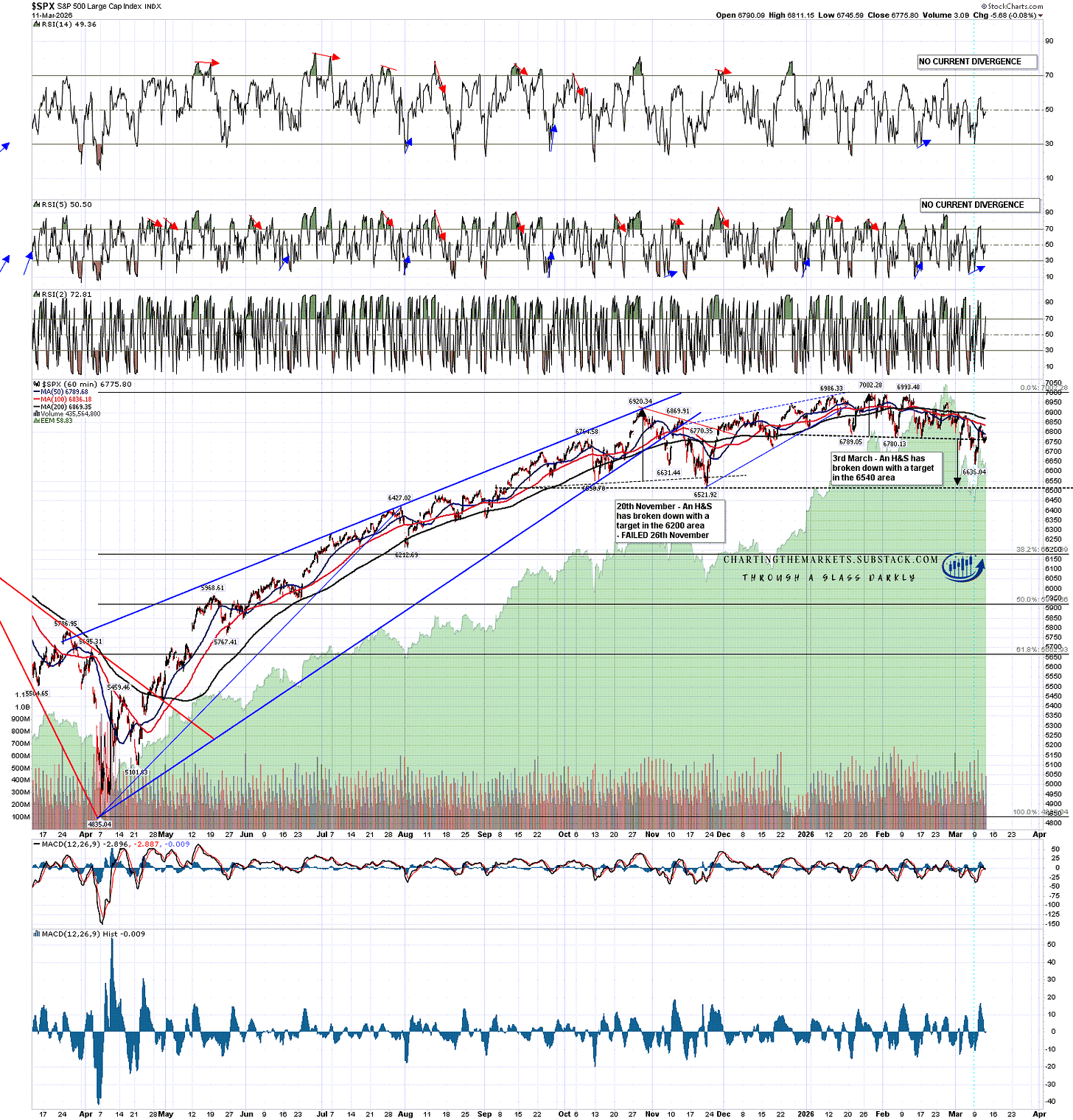 On SPX the rising wedge from April peaked in October and broke down in November. Since then SPX has essentially traded sideways and I’ve been watching a possible H&S that has been forming and broke down at the start of this week with a target in the 6540 area. That target is close to a possible larger H&S neckline, or asymmetric double top support, in the 6522 area This is a possible overall setup for a strong decline that could target the 6040 - 6120 area: