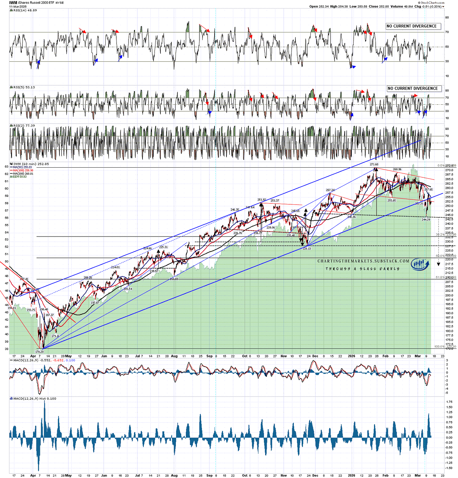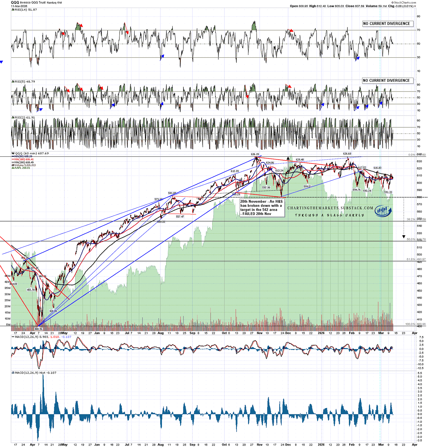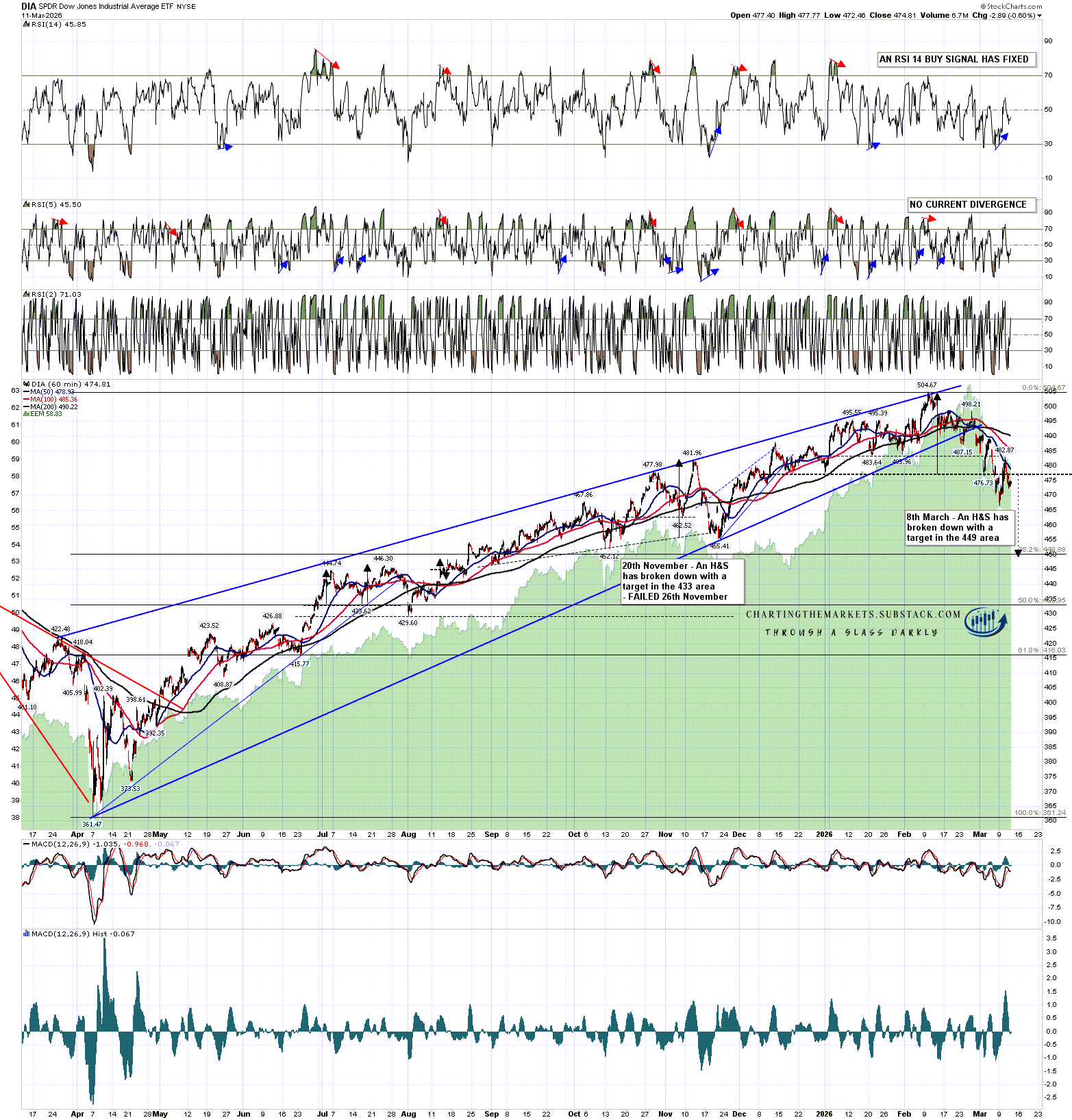 On DIA the rising wedge from April peaked in October and broke down in November before a return to wedge resistance in February that expanded the original wedge. A possible H&S is forming that on a sustained break below the low this week at 476.73 would look for a target in the 450 area: